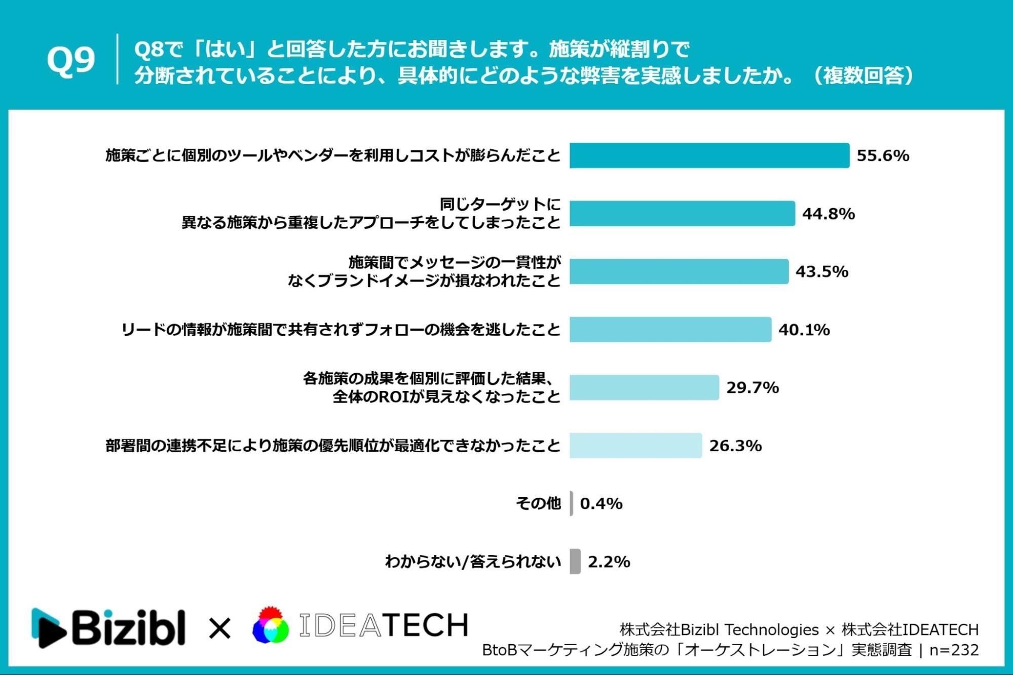 「Q9. Q8で「はい」と回答した方にお聞きします。施策が縦割りで分断されていることにより、具体的にどのような弊害を実感しましたか。(複数回答)」(n=232)と質問したところ、「施策ごとに個別のツールやベンダーを利用しコストが膨らんだこと」が55.6%、「同じターゲットに異なる施策から重複したアプローチをしてしまったこと」が44.8%、「施策間でメッセージの一貫性がなくブランドイメージが損なわれたこと」が43.5%という回答となりました。
