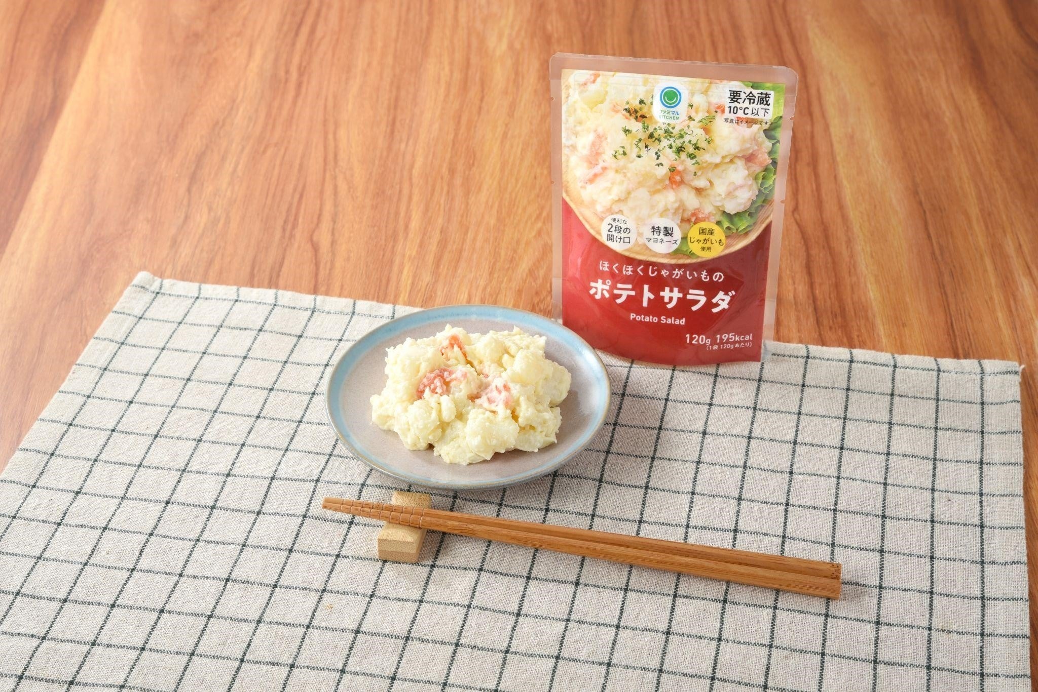 【内容】国産のじゃがいもを使用した、ほくほくとした食感が特徴のポテトサラダです。じゃがいも本来の素材を活かすように、酸味の少ない特製マヨネーズを使用して味付けしました。