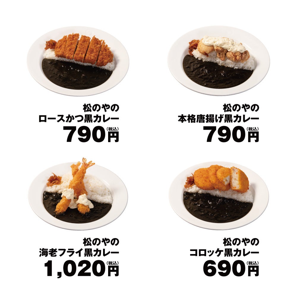 商品名 <松のや専門店> 松のやのロースかつ黒カレー 790円 松のやの本格唐揚げ黒カレー 790円 松のやの海老フライ黒カレー 1,020円 松のやのコロッケ黒カレー 690円 <松のや・マイカリー食堂複合店舗> 黒カレー 600円 ロースかつ黒カレー 790円 オムレツ黒カレー 800円 ロースかつオムレツ黒カレー 1,020円 ※全て税込価格です。また、店内・お持ち帰りの税込価格は同一です。 ※お持ち帰りいただけます。お持ち帰りのみそ汁は、別途60円でお買い求めいただけます。 ※株主優待券は上記のメニューにご使用いただけます。