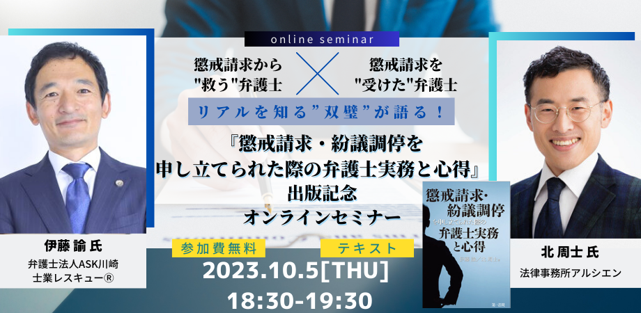 【2023年10月5日開催|無料セミナー】懲戒請求のリアルを知る”双璧”が語る!『懲戒請求・紛議調停を申し立てられた際の弁護士実務と心得』出版記念オンラインセミナー