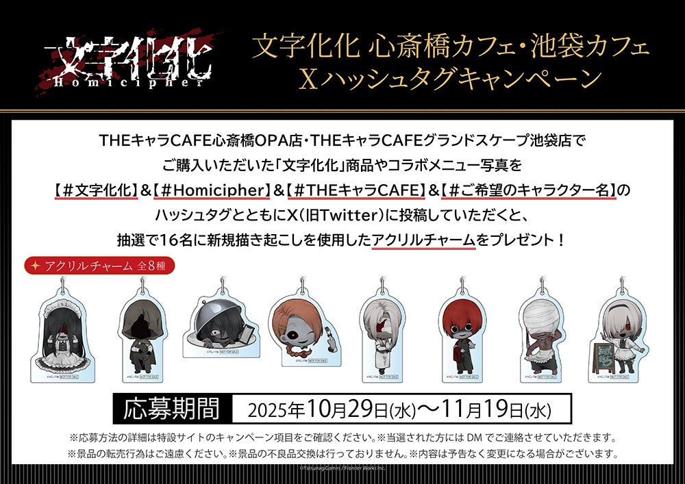 株式会社コンテンツシード(本社:東京都品川区、代表取締役:大塚 則和)は、2025年10月29日(水)より「THEキャラCAFE 心斎橋OPA店」、2025年11月1日(土)より「THEキャラCAFE グランドスケープ池袋店」にて『文字化化』とのコラボカフェを開催いたします。