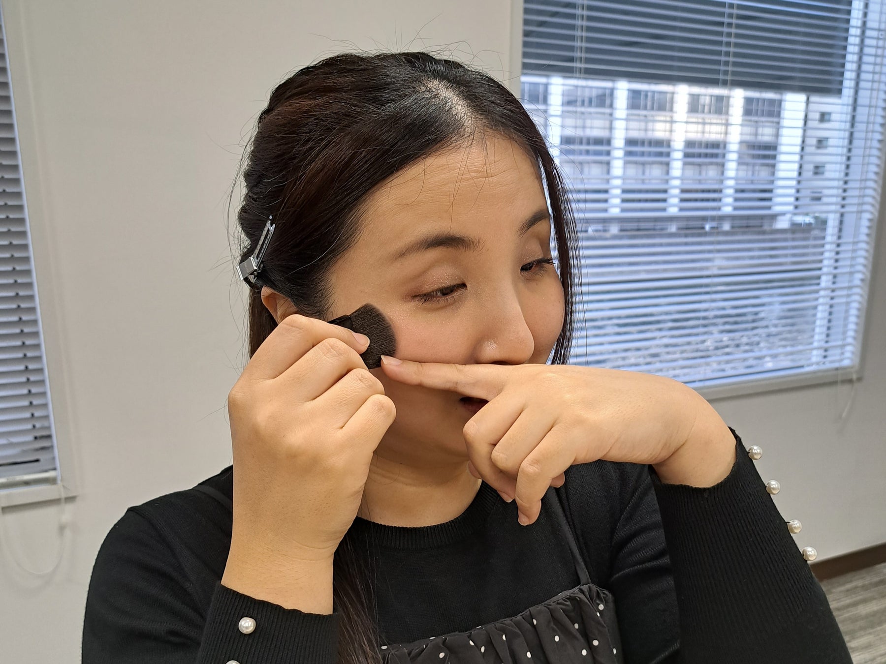 「聞くだけでコツがわかる ミラーレスメイク」を聞きながらメイクをする視覚に障がいのある女性