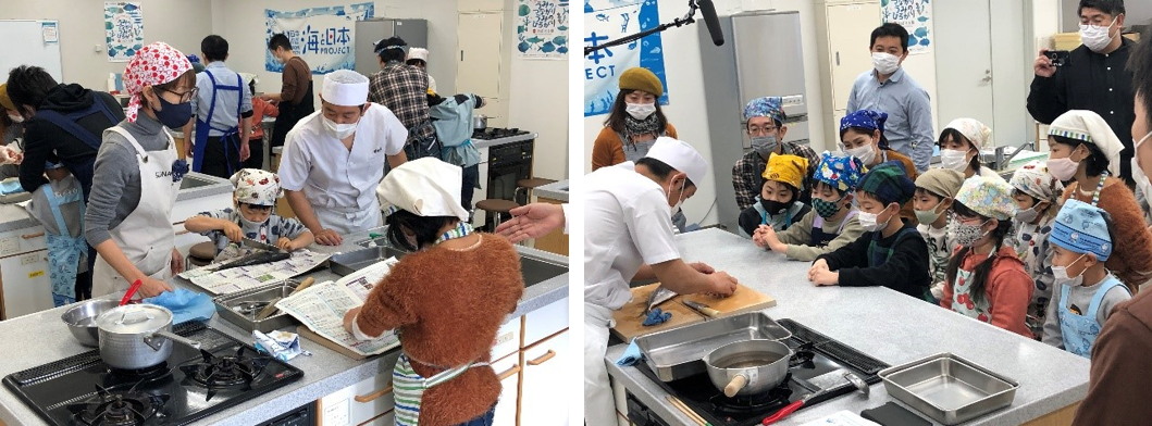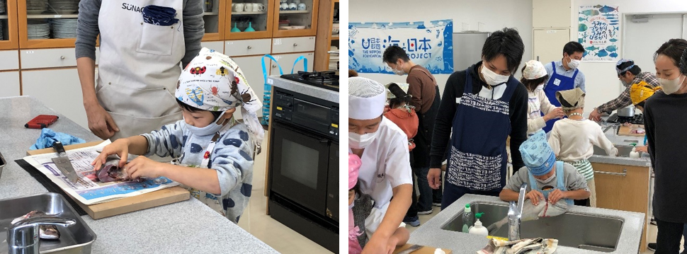 ・開催概要:”魚をさばく”という日本古来の調理技法を次の世代へ継承するとともに、豊かで健全な海を未来に引き継ぐアクションの輪を広げる取り組みとして、①基本のアジ+地域の特色ある魚をさばく②その⼟地ならではの、郷⼟料理や地域の食材を使った料理をつくる③海にまつわる講義を受ける、以上を実施。