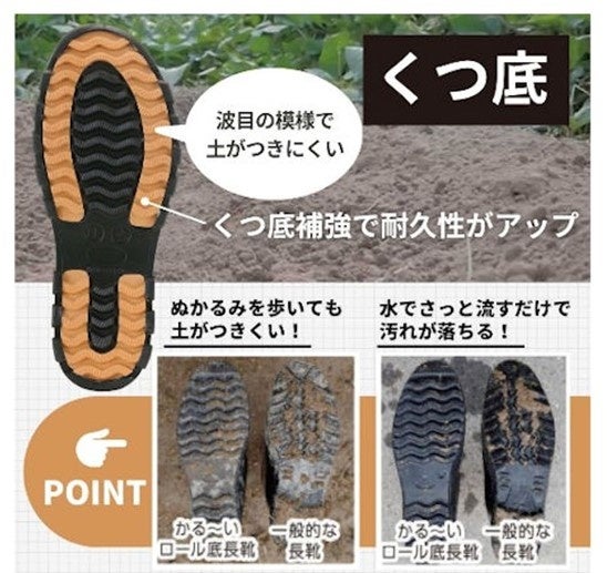 本製品の靴底には波目模様のロール底を採用しており、この形状が土離れを良くし、長靴が重たくなるのを防ぎます。土がついてもサッと水で流すだけで簡単に汚れが落とせます。今回のリニューアルでは、底にプラスチックとゴムの特性を兼ね備えたTPE樹脂を使用し、耐久性をアップさせました。
