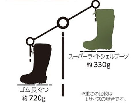 スーパーライトシェルブーツは軽量なEVA素材を使用しており、重さは片足約330g(※Lサイズの場合)。両足合わせても約660gと一般的なゴム長靴の約半分の重量です。以前の「かる~いロール底長靴」と比べてさらに10%(片足約30g)の軽量化を実現しました。