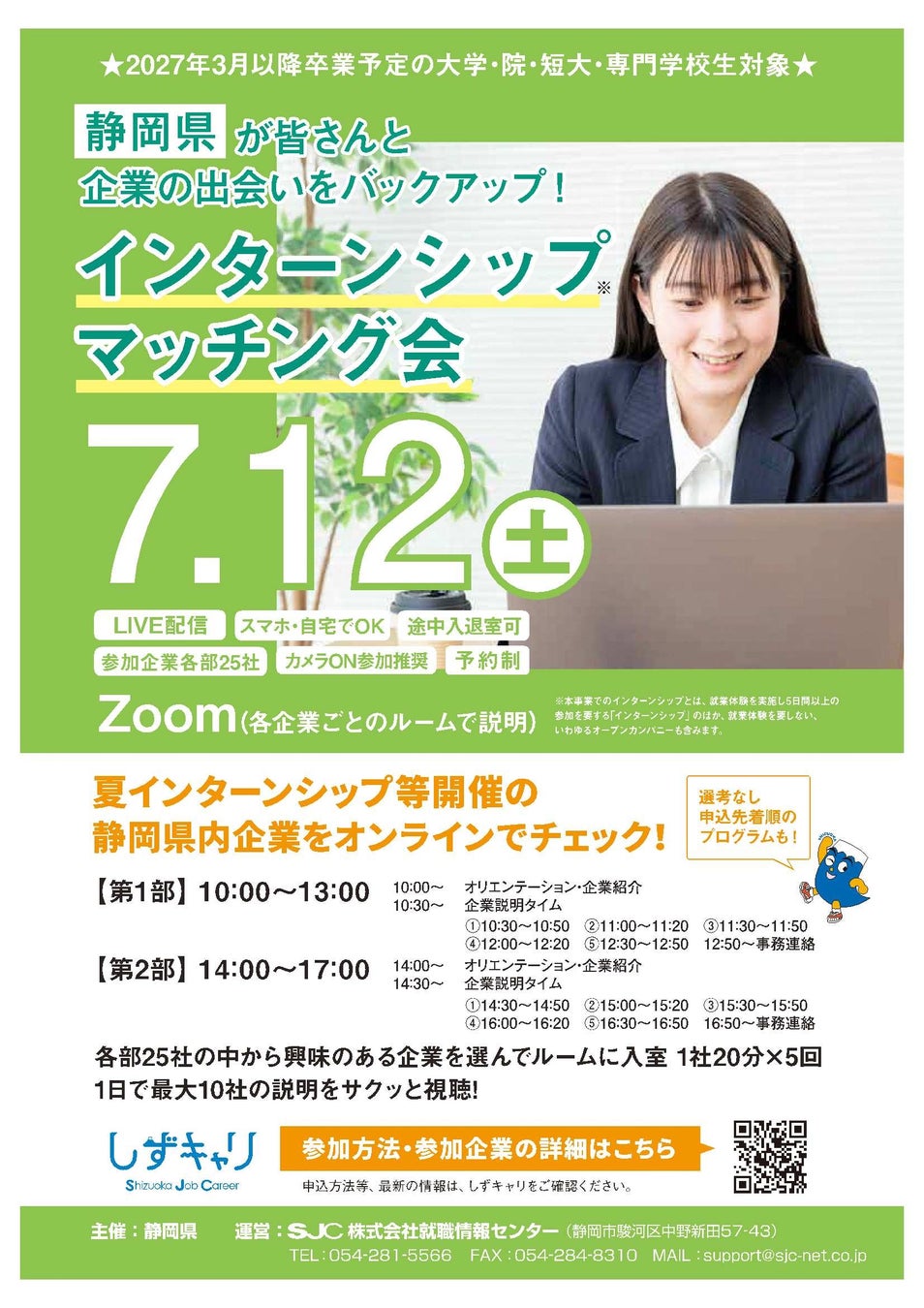 静岡県では、現在大学1~3年生の方など2027年3月以降卒業予定の学生の方を対象として、「インターンシップマッチング会 オンラインLIVE」を開催します。