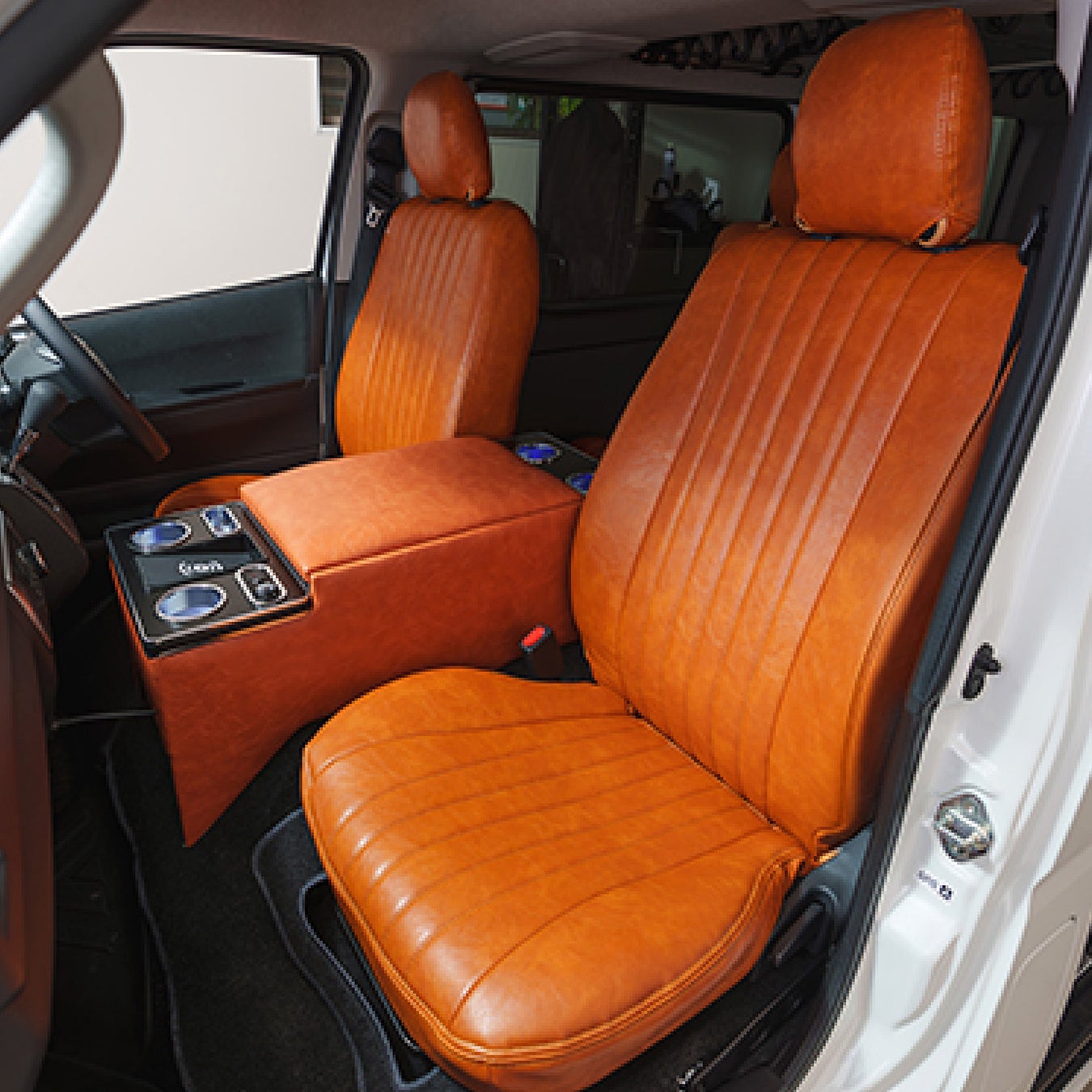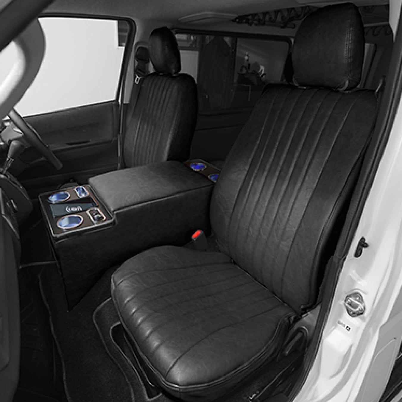ハイエース200系専用 1台フルセット シートカバー&コンソールボックス。PVCレザー素材を採用したシートカバーと、大容量収納、ワイヤレス充電機能を備えたコンソールボックスのセットで、車内を一新!
