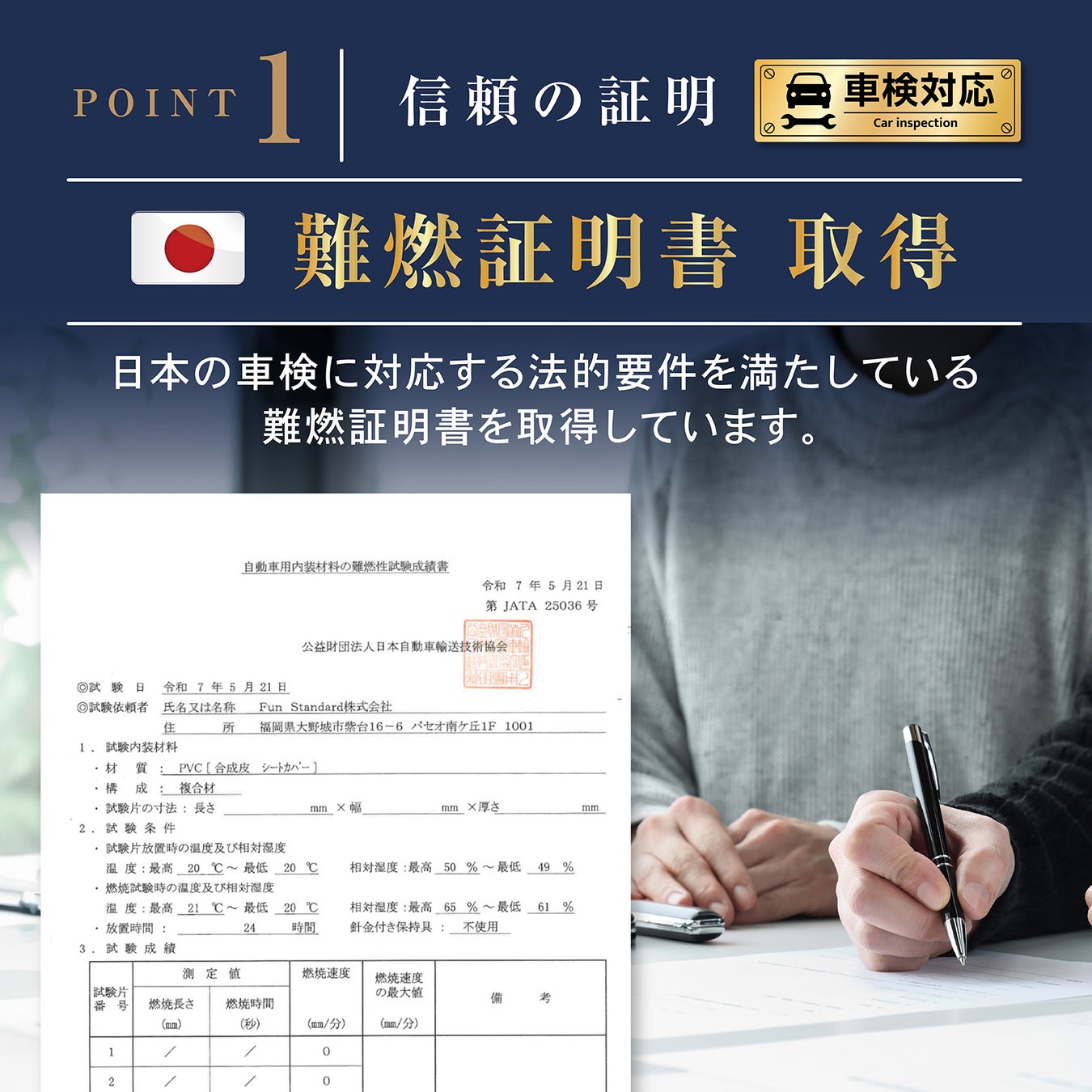 日本の車検に対応する、法的要件を満たしている難燃証明書を取得しています。