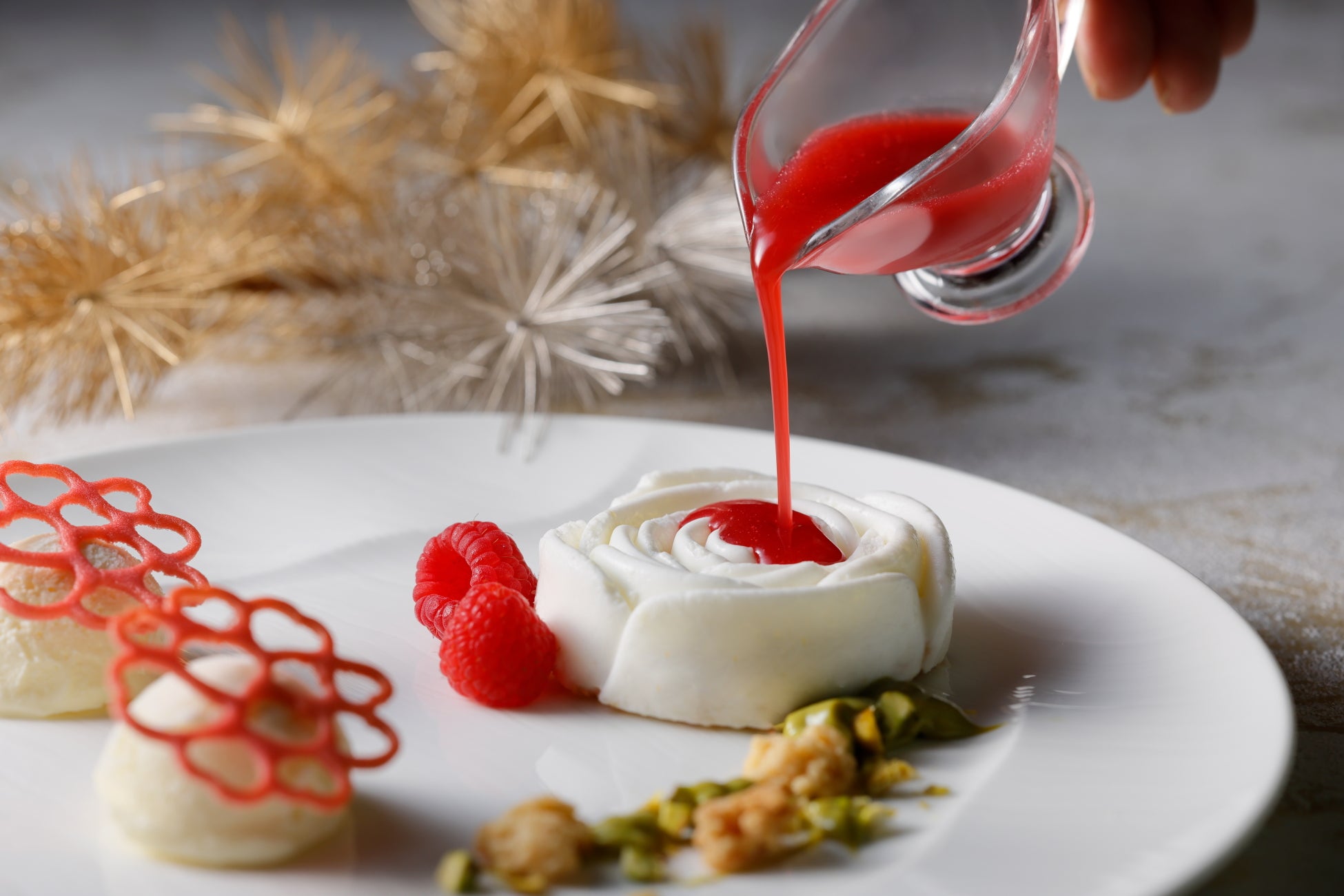 滋賀県が誇るブランド牛「近江牛」をメインに、目の前で仕上げるお料理を楽しむディナーコース。食後には、滋賀県・山田牧場のチーズを使用した純白のフロマージュが登場。白いバラがオウミキイチゴのソースで鮮やかな赤に染まるドラマティックな演出が、お二人の特別な夜に華を添えます。