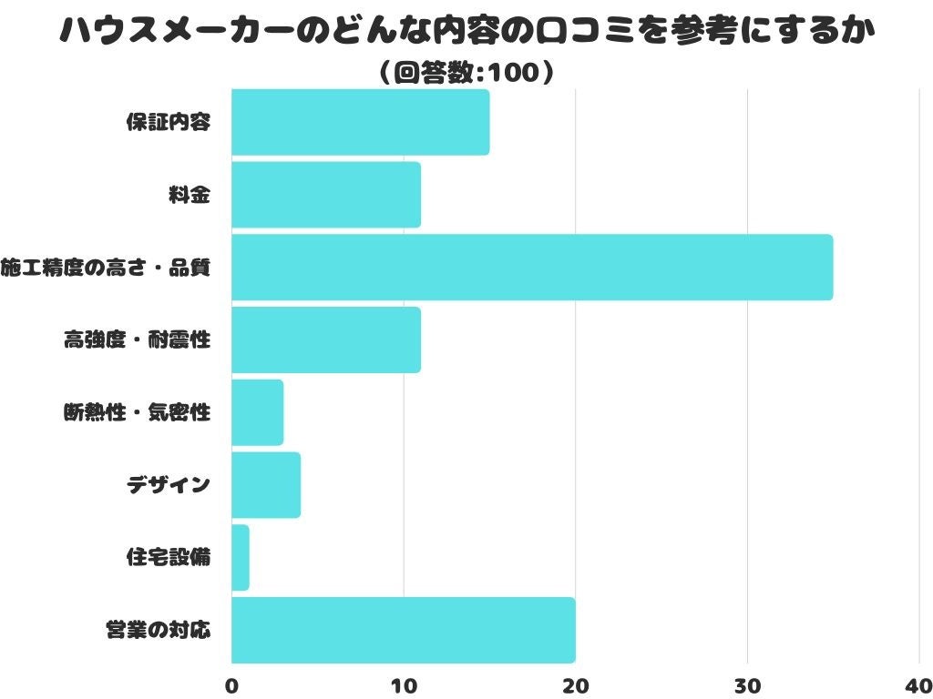 ハウスメーカーのどんな内容の口コミを参考にするかをアンケートにて調査したところ、1位は「施工精度の高さ・品質」でした。