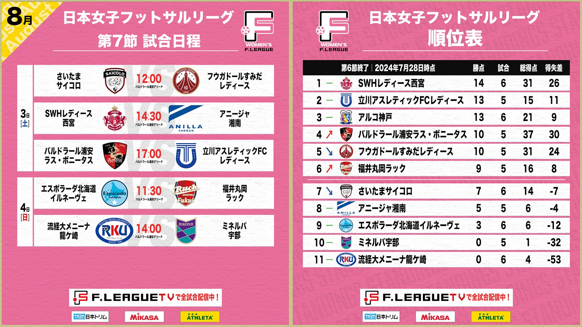 8月3日(土)、4日(日)、 バルドラール浦安アリーナ(千葉県浦安市舞浜)にて、日本女子フットサルリーグの第7節が開催されます。