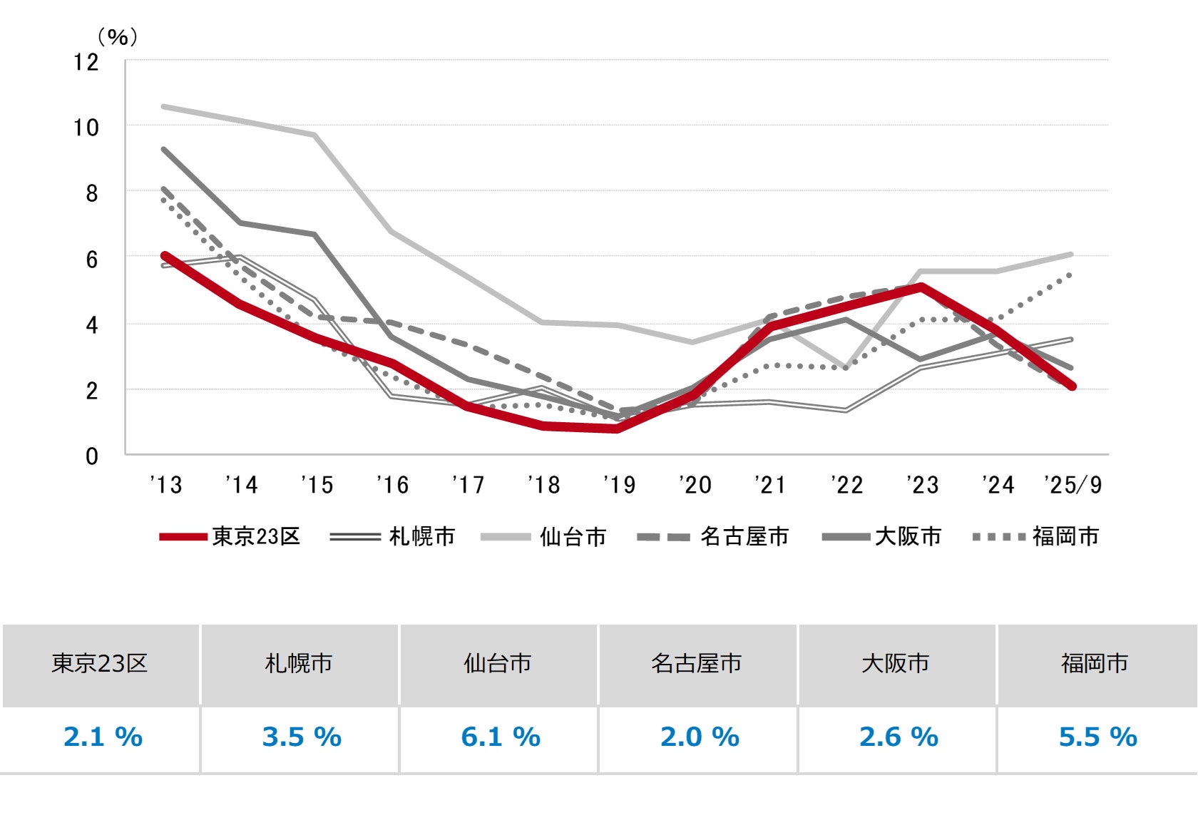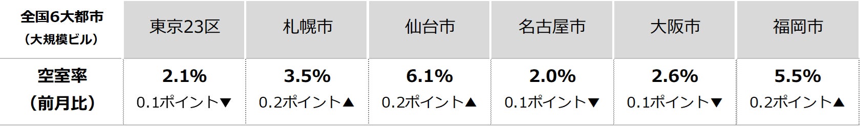 三幸エステート株式会社(本社:東京都中央区、取締役社長:福島正二郎)は、2025年9月度の東京都心5区(千代田区、中央区、港区、新宿区、渋谷区)および全国6大都市(東京、札幌、仙台、名古屋、大阪、福岡)の大規模ビル※1のマーケットデータをまとめた「オフィスマーケット2025年10月号」を公表します。