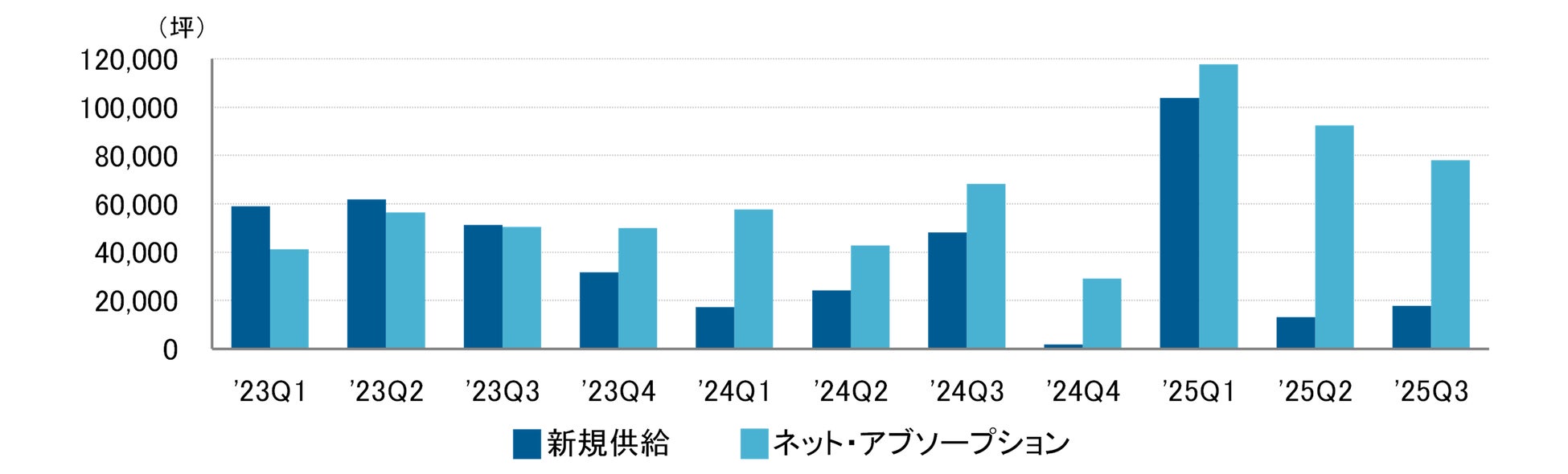 ネット・アブソープション(吸収需要)はオフィス需要の指標であり、一定期間におけるテナント入居面積(稼働面積)の増減を表す。直近2025年第3四半期の吸収需要は約8万坪の高水準となった。需要が新規供給を上回る需要超過は、8期連続となっている。