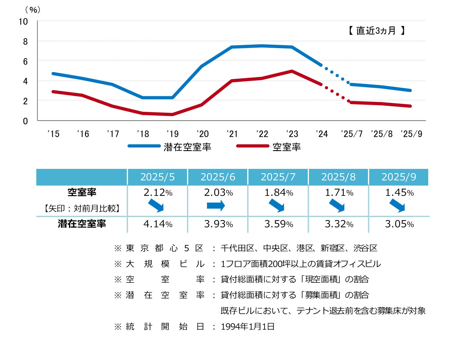 空室率・潜在空室率 7ヵ月連続の低下 需給バランスは引き締まり傾向