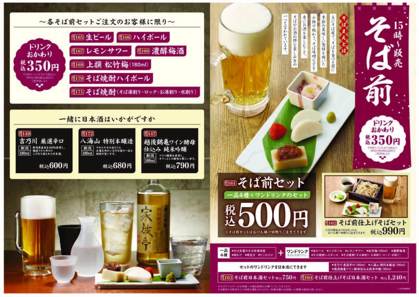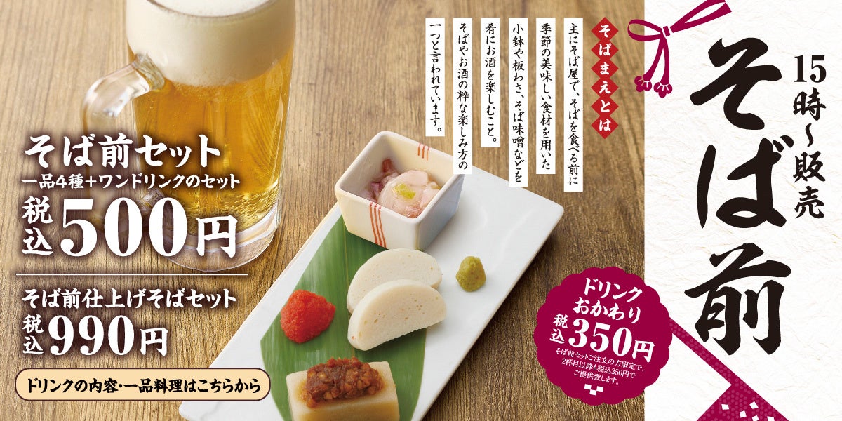 ・「そば前セット」をご注文いただいたお客様の「ドリンクおかわり」 税込350円