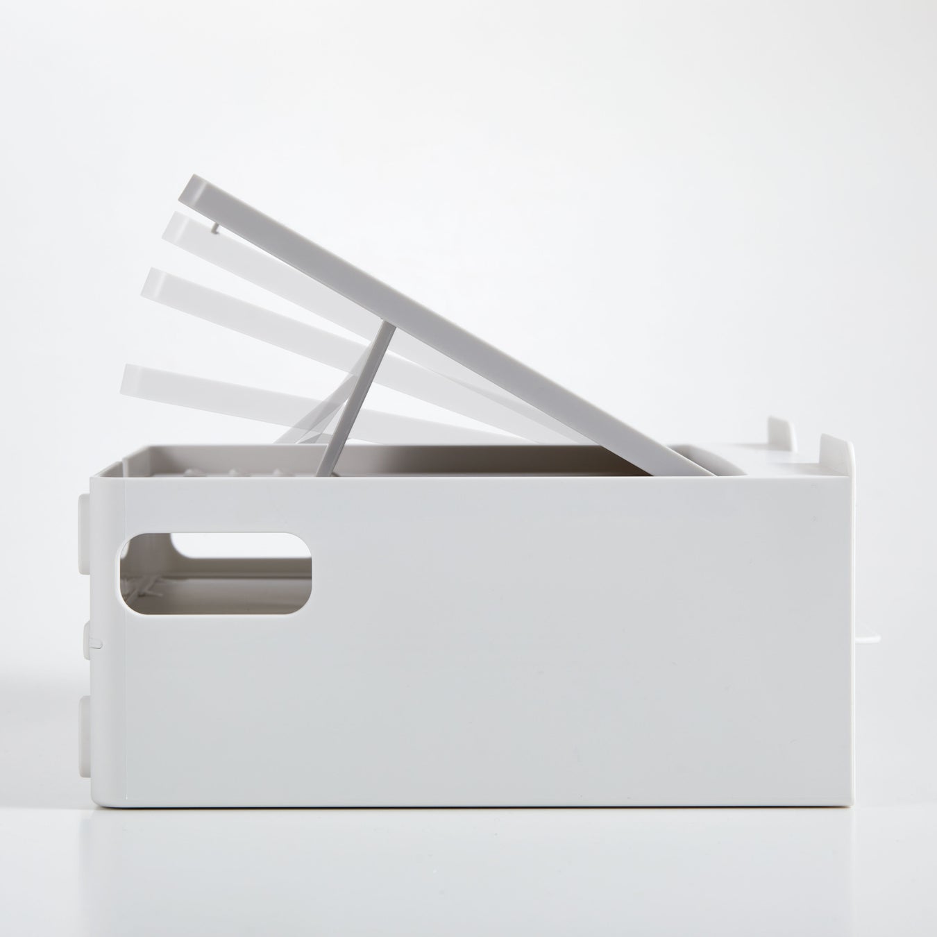 ノートPCとマウスやキーボードなどのワークツールをひとまとめに収納できます。A4のボックスファイルと同サイズのため棚にスッキリと収まり、上部のスタンドを上げるとPCスタンドとして使用可能です。スタンドは4段階で高さが変えられるため、ノートPCの画面を最適な高さに調節できます。市販のPCスタンドよりもスタンドの位置が高いため目線を上げた姿勢を保つことができ、長時間の作業による疲労を軽減します。14インチまでのノートPCに対応し、ワークツールが取り出しやすい引き出し付きです。