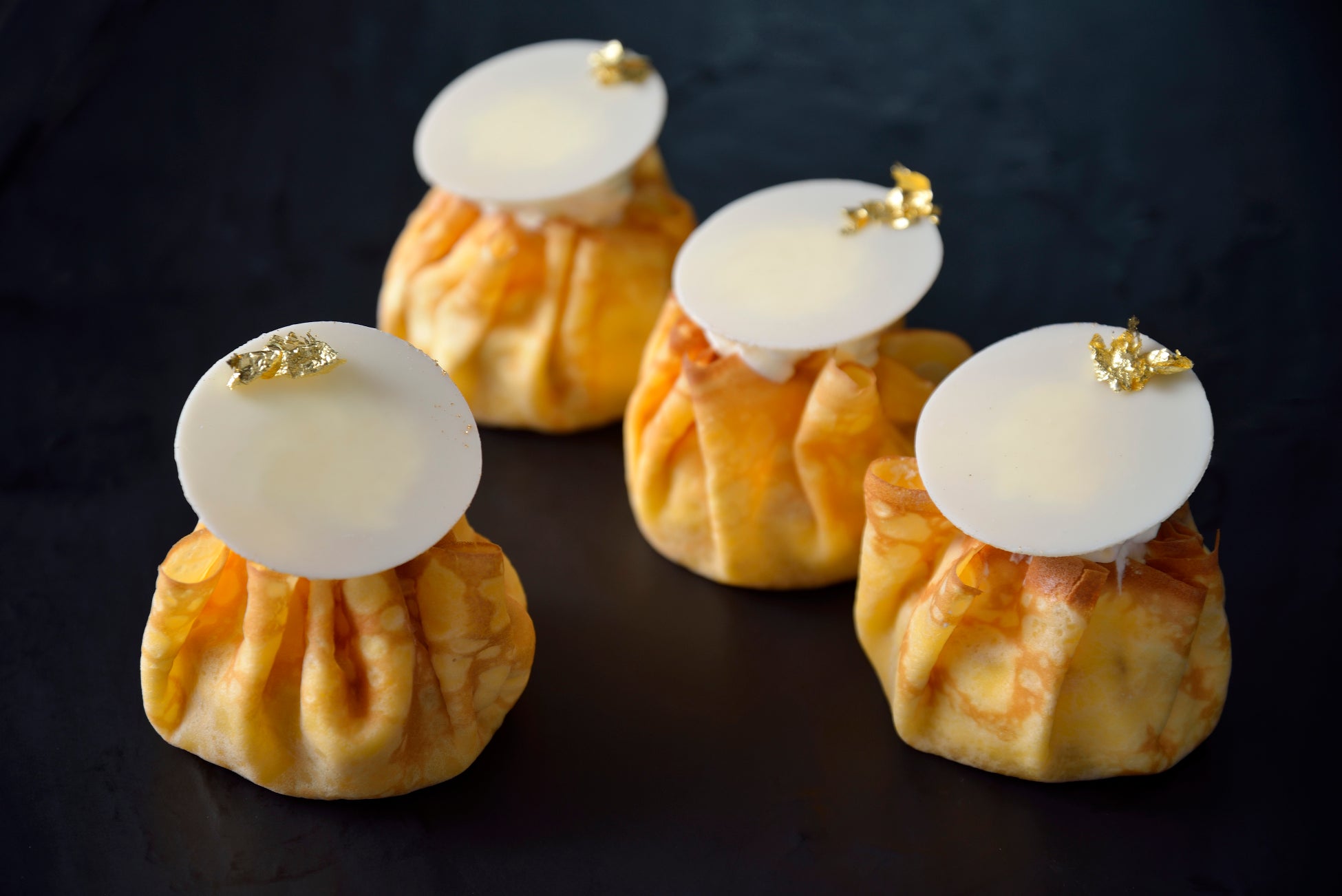 リンゴのキャラメリゼ入りのスウィートポテトを、しっとりとしたクレープで包んだ秋限定のスイーツ。リンゴの食感とほどよい酸味がきいたキャラメル風味のスウィートポテトを、満月のように可愛らしく仕立てました。