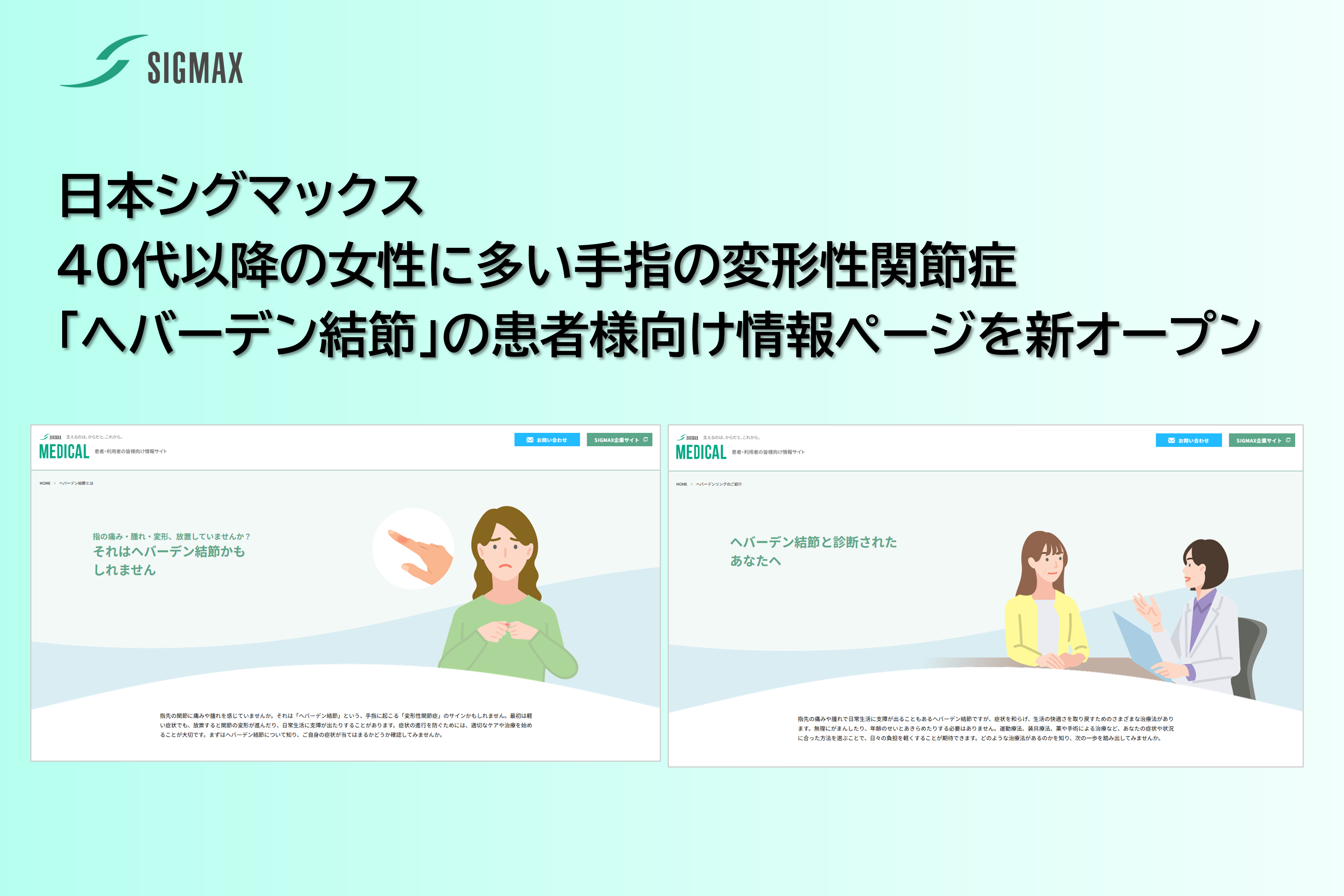 こうした背景を受け、当社が運営している医療関係者・製品利用者向けWEBサイト「SIGMAX MEDICAL」にて、患者様が適切な受診・相談につながるよう、ヘバーデン結節に関する一般的な疾患情報をまとめたページを新設しました。