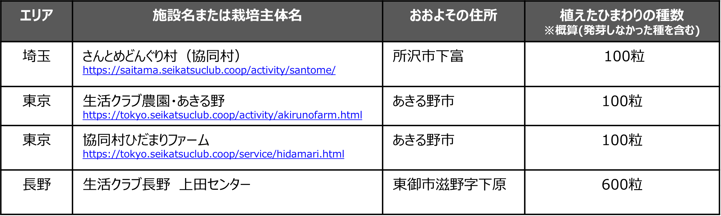 エリア | 施設名または栽培主体名 | おおよその住所 | 植えたひまわりの種数 ※概算(発芽しなかった種を含む) |