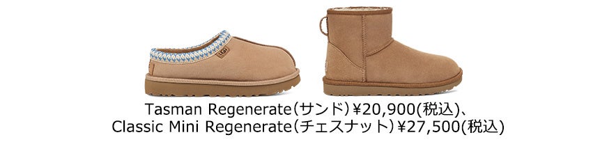 また、UGGは2022年10月発売のClassic Mini Regenerate(クラシックミニ リジェネレイト)や2023年1月発売のTasman Regenerate(タスマン リジェネレイト)から、シープスキンの素材の調達先をリジェネラティブ(環境再生型)農業を実践する農場へ変えることで、地球環境を修復しより豊かにすることに貢献するイニシアティブを継続しています。ともにUGGのアイコニックなシルエットはそのままに、リジェネラティブ(環境再生型)農業を実践する農場から調達したシープスキン素材や再生可能なサトウキビから作られたEVAソールで定番のクラシックブーツやスリッポンが生まれ変わりました。