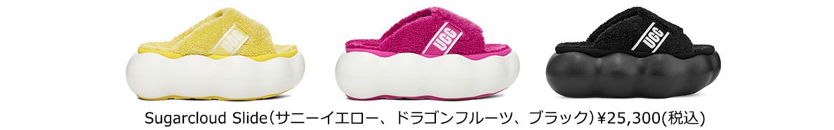 今年のアースデイを機に、UGGはサステナブル製品の最新作、Sugarcloud Slide(シュガークラウド スライド)をご紹介できることを誇りに思います。UGGのシグネチャーであるフラッフを植物由来のTENCEL™リヨセル と再生ポリエステルをブレンドした素材でアップデート。サステナブルな素材と雲のような柔らかさを融合させたこのプラットフォームスリッポンは、再生可能で成長の早いサトウキビ由来のEVA素材からつくられたミッドソールと再生ラバーを50%使用したモールドタイプのラバーアウトソールが特徴です。