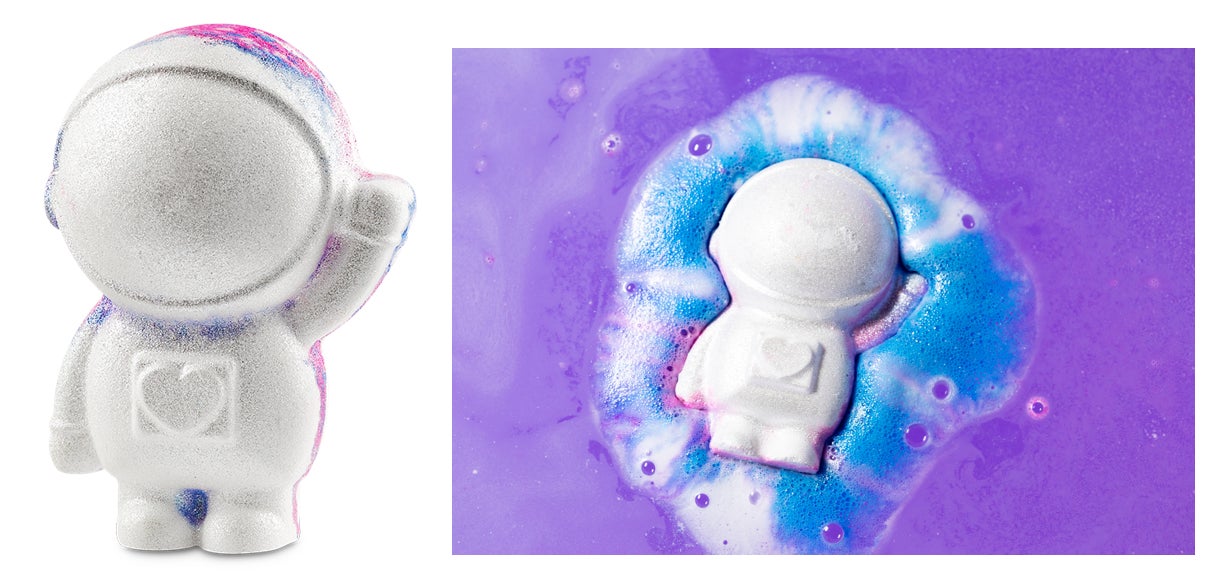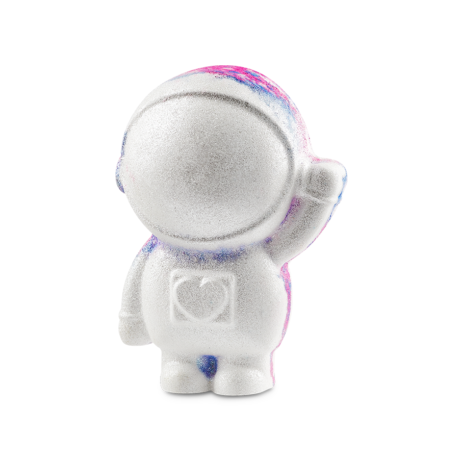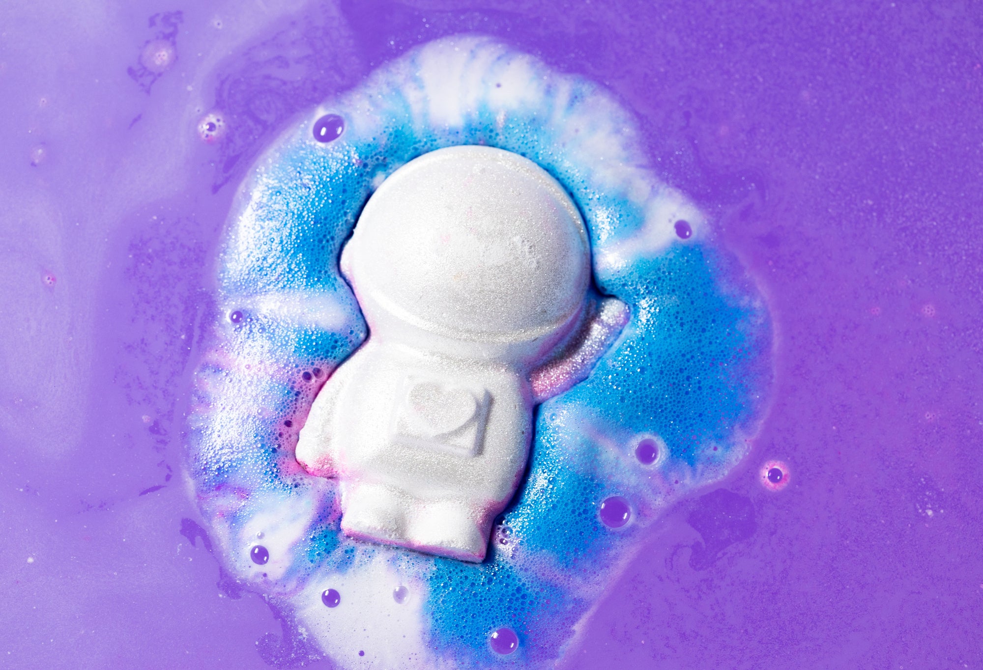 宇宙飛行士と一緒にお風呂の中に飛び込めば、宇宙遊泳気分が味わえそうなバスボムです。小惑星爆発のようなポッピングキャンディの弾ける音や水面に広がるピンクとブルーの渦巻はまるで星雲のようです。