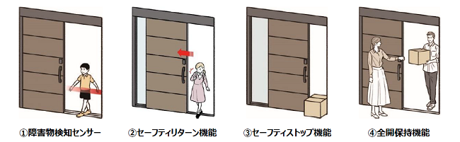 センサーが人や障害物を検知する「障害物検知センサー」や、⾃動開閉中にドアが⼈や障害物に当たると反転して開く「セーフティリターン機能」など、子どもから大人まで安心して利用できる安全機能を設定しています。