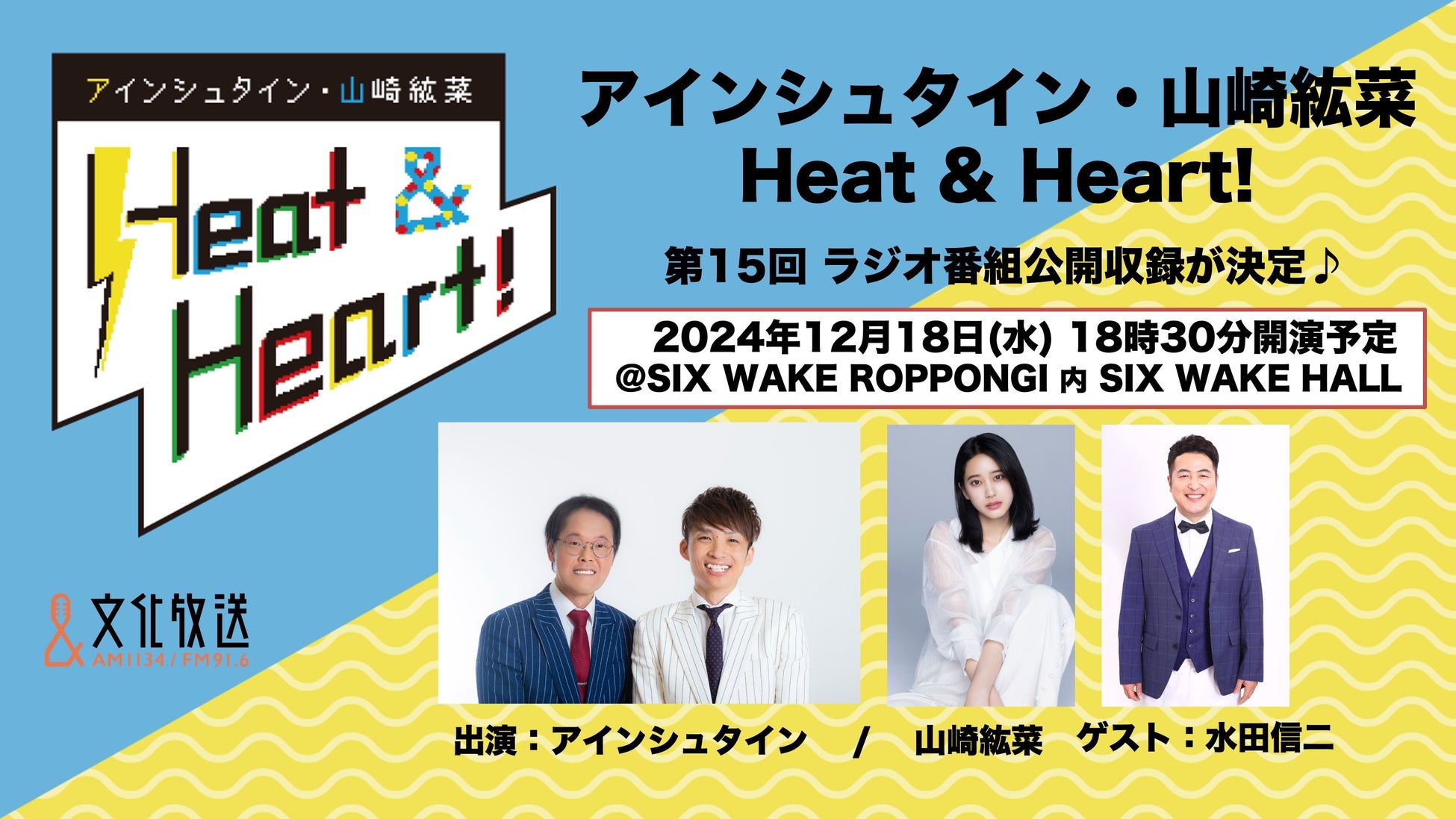 お笑いコンビのアインシュタインと女優の山崎紘菜がダブルパーソナリティを務める『アインシュタイン・山崎紘菜 Heat & Heart!』(文化放送 毎週日曜日 午後4時00分~4時55分/ラジオ大阪 毎週日曜日 午後4時30分~4時55分)。このたび、12月18日(水)午後6時30分より「SIX WAKE ROPPONGI」内「SIX WAKE HALL」にて公開録音イベントを開催することが決定しました。