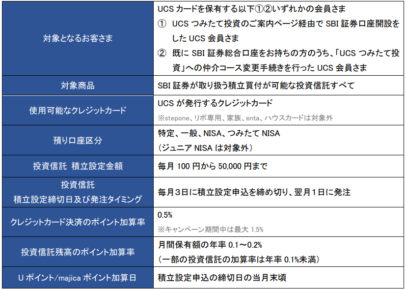 株式会社SBI証券(本社:東京都港区、代表取締役社長:髙村正人、以下「当社」)と株式会社UCS(代表取締役社長:後藤秀樹、以下「UCS」)は、2022年12月16日(金)から、金融商品仲介業務で提携し、UCSが発行するクレジットカードで投資信託が買える「UCSつみたて投資」と、取引実績に応じてUポイントまたはmajicaポイントを加算するサービスの提供を開始しました。