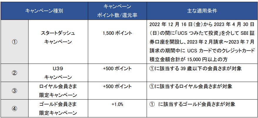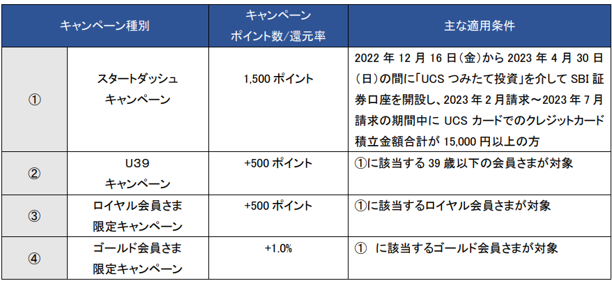UCSつみたて投資の開始に伴い、最大2,500ポイントが貯まる期間限定のスタートダッシュキャンペーンを開催します。さらにゴールドカード会員さまに限り、ポイント3倍(+1.0%)アップとなりますので、この機会に是非ご利用ください。