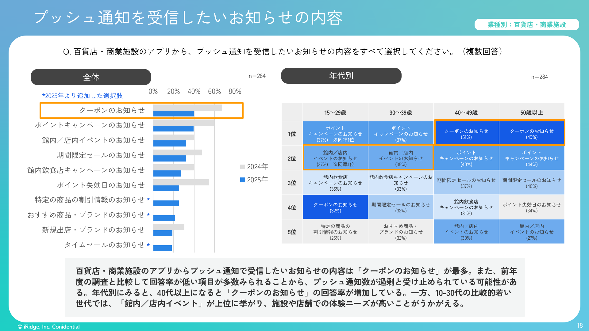 ・10-20代の上位には30代以上でも人気の高いポイントキャンペーンやセール系も入る一方、館内・店内イベントや飲食店キャンペーンなど、コト消費への関心が高いことが浮き彫りになった