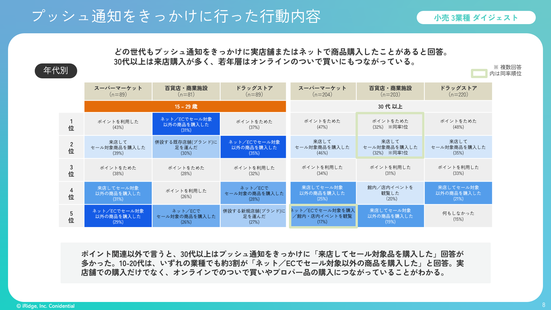 ・ポイント関連以外で言うと、30代以上はプッシュ通知をきっかけに「来店してセール対象品を購入した」回答が多く、百貨店・商業施設アプリでは同率1位だった