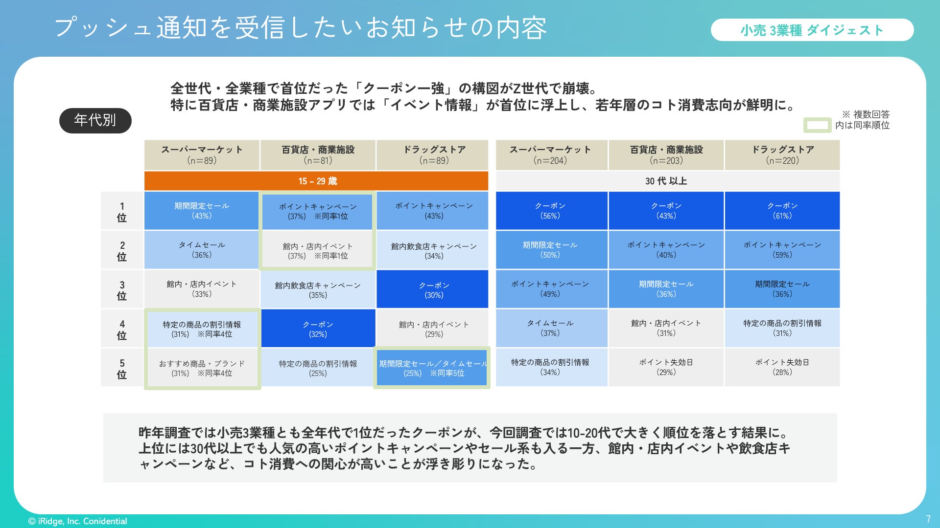 ・プッシュ通知を受信したいお知らせの内容では、昨年調査時は小売3業種とも全年代で1位だったクーポンが、今回調査では10-20代(Z世代)で大幅下落