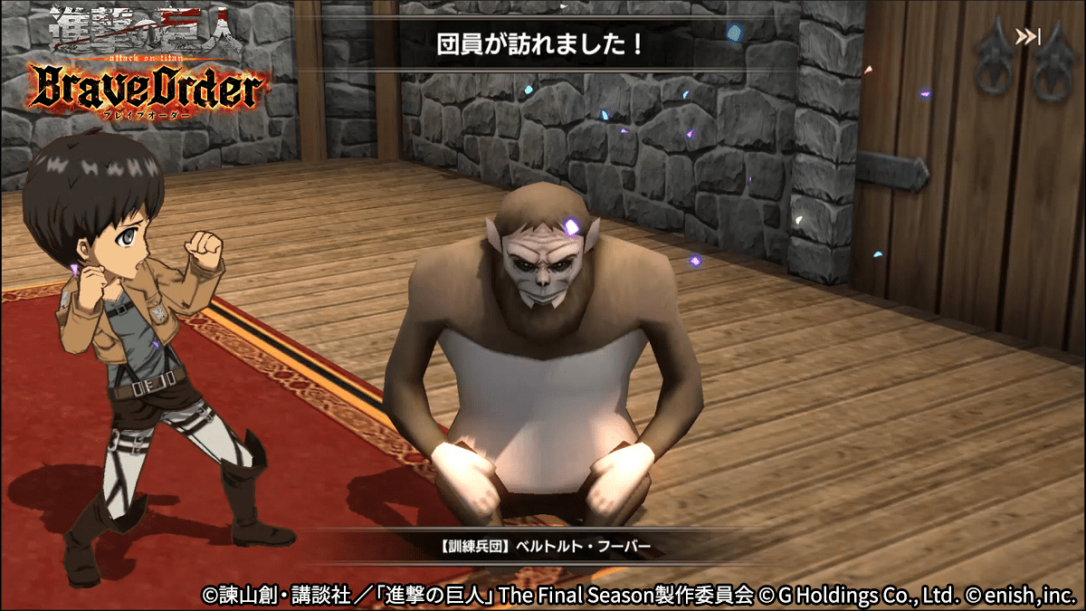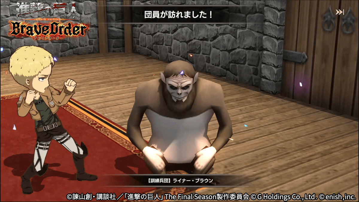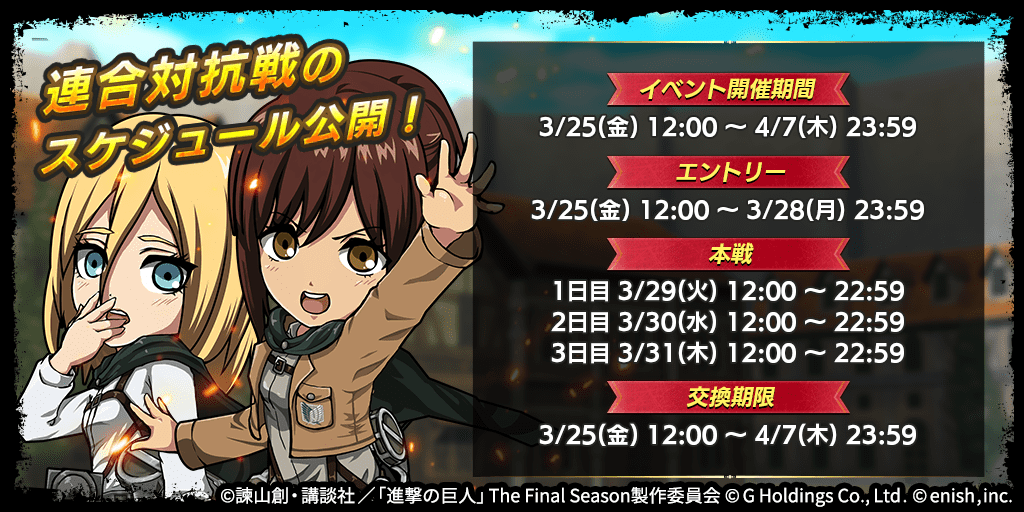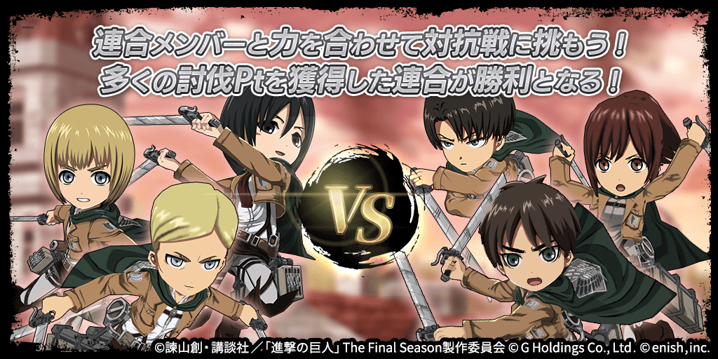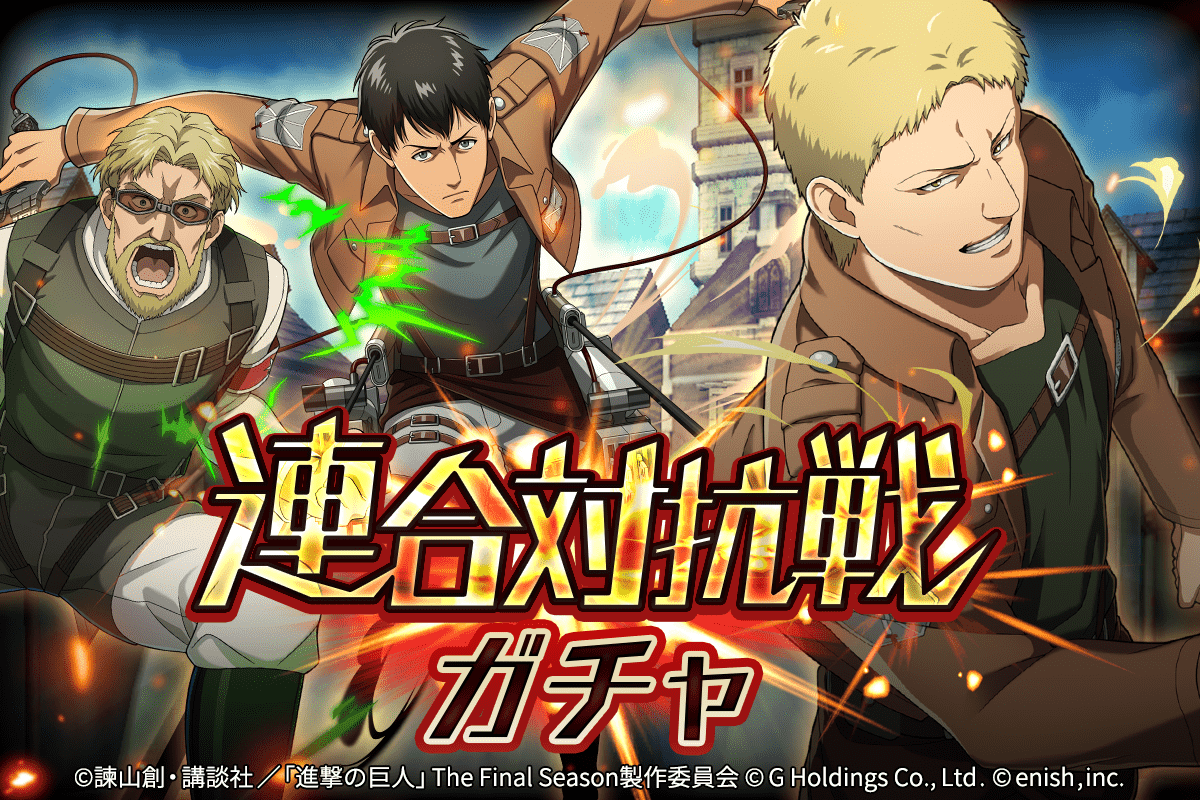株式会社enish(本社:東京都港区、代表取締役社長:安徳 孝平、以下enish)は、アニメ『進撃の巨人』のスマートフォンゲーム最新作「進撃の巨人Brave Order」にて、初のGVEイベントとなる「連合対抗戦」を開催いたします。また、当イベントに合わせて新キャラクターのライナー、ベルトルト、ジークの出現率がアップした連合対抗戦ガチャを開催!最新情報は、ゲーム公式サイト・ゲーム公式Twitterアカウントにて随時公開して行きますので、ぜひご覧ください。