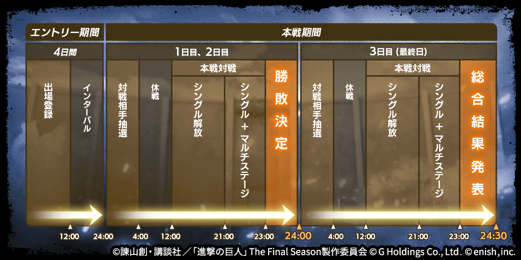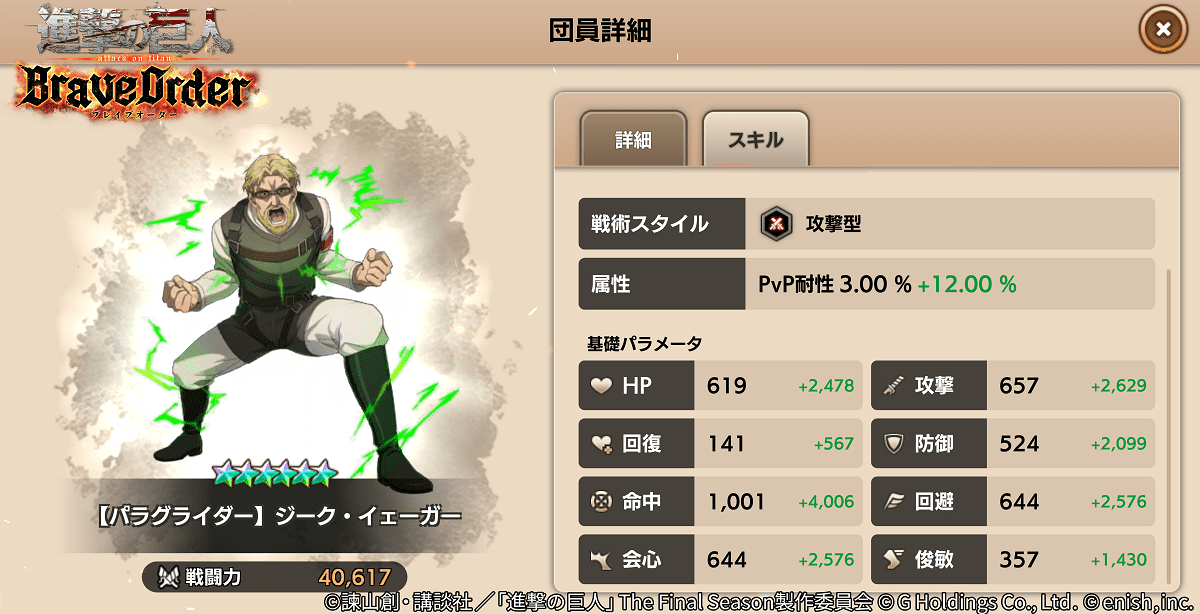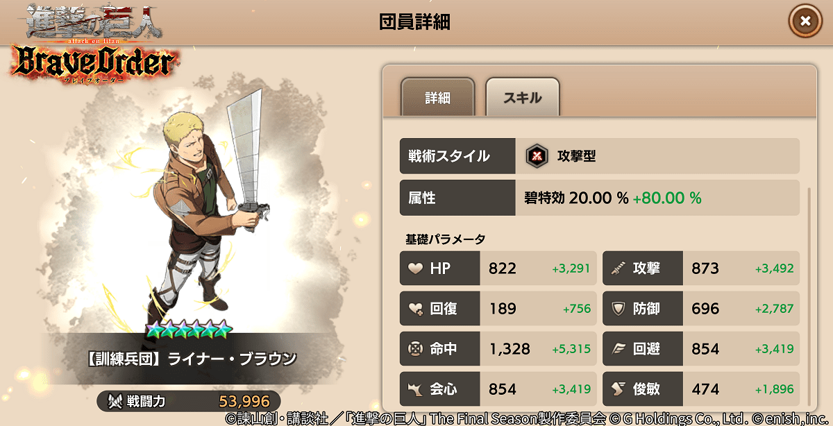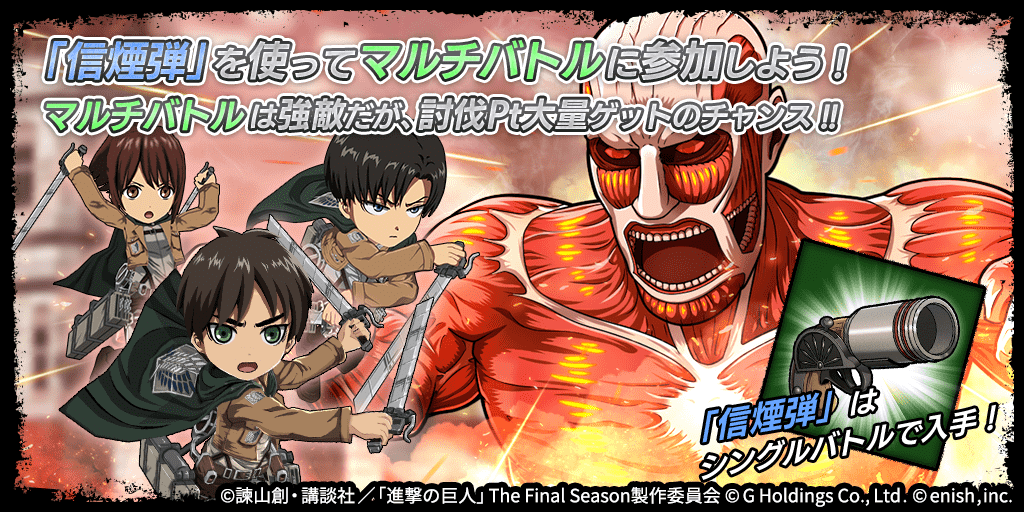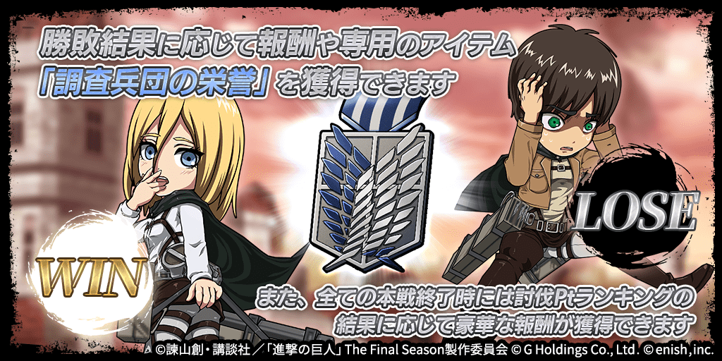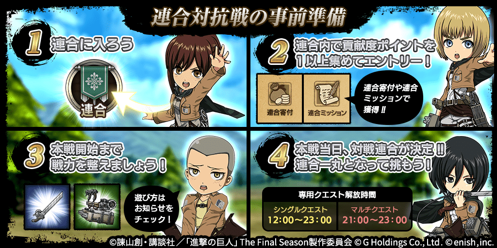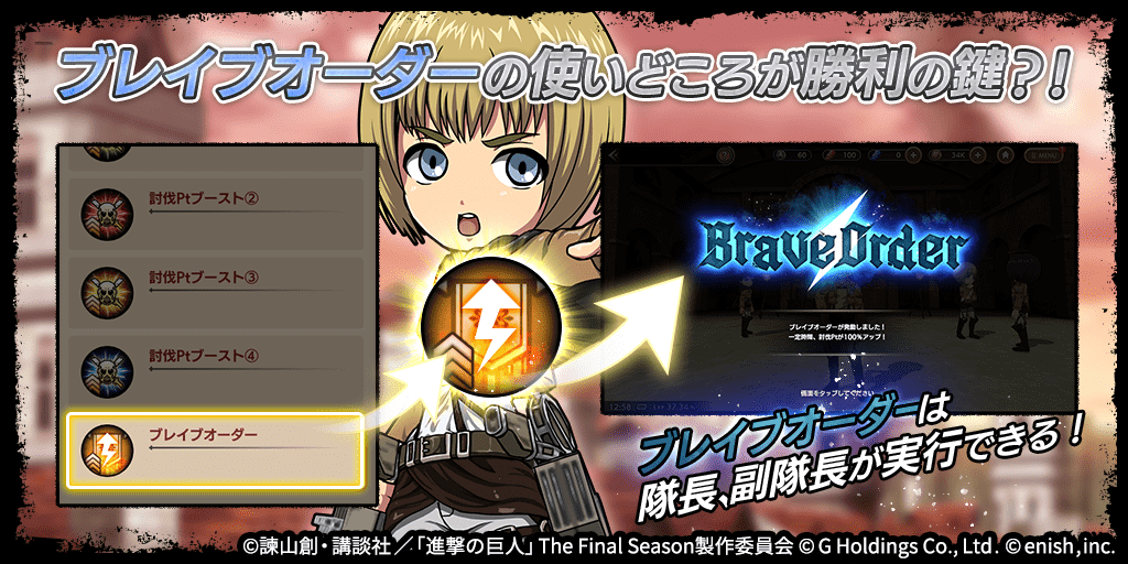 株式会社enish(本社:東京都港区、代表取締役社長:安徳 孝平、以下enish)は、アニメ『進撃の巨人』のスマートフォンゲーム最新作「進撃の巨人Brave Order」にて、初のGVEイベントとなる「連合対抗戦」を開催いたします。また、当イベントに合わせて新キャラクターのライナー、ベルトルト、ジークの出現率がアップした連合対抗戦ガチャを開催!最新情報は、ゲーム公式サイト・ゲーム公式Twitterアカウントにて随時公開して行きますので、ぜひご覧ください。