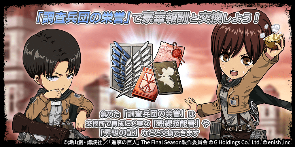 交換所はイベント終了後に閉鎖しますが「調査兵団の栄誉」自体は次回以降の開催時に持ち越して使用できます。