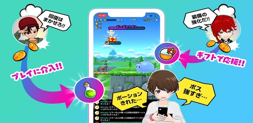 視聴者は従来のライブ配信のようにコメントやギフトアイテムを贈るだけでなく、実際に配信者と一緒にゲームをプレイする「参加型ライブゲーム」や、ギフトアイテムを通じてゲームに対して影響を与える「介入型ライブゲーム」など、今までのゲームやライブ配信とは全く違った体験を楽しむことができます。