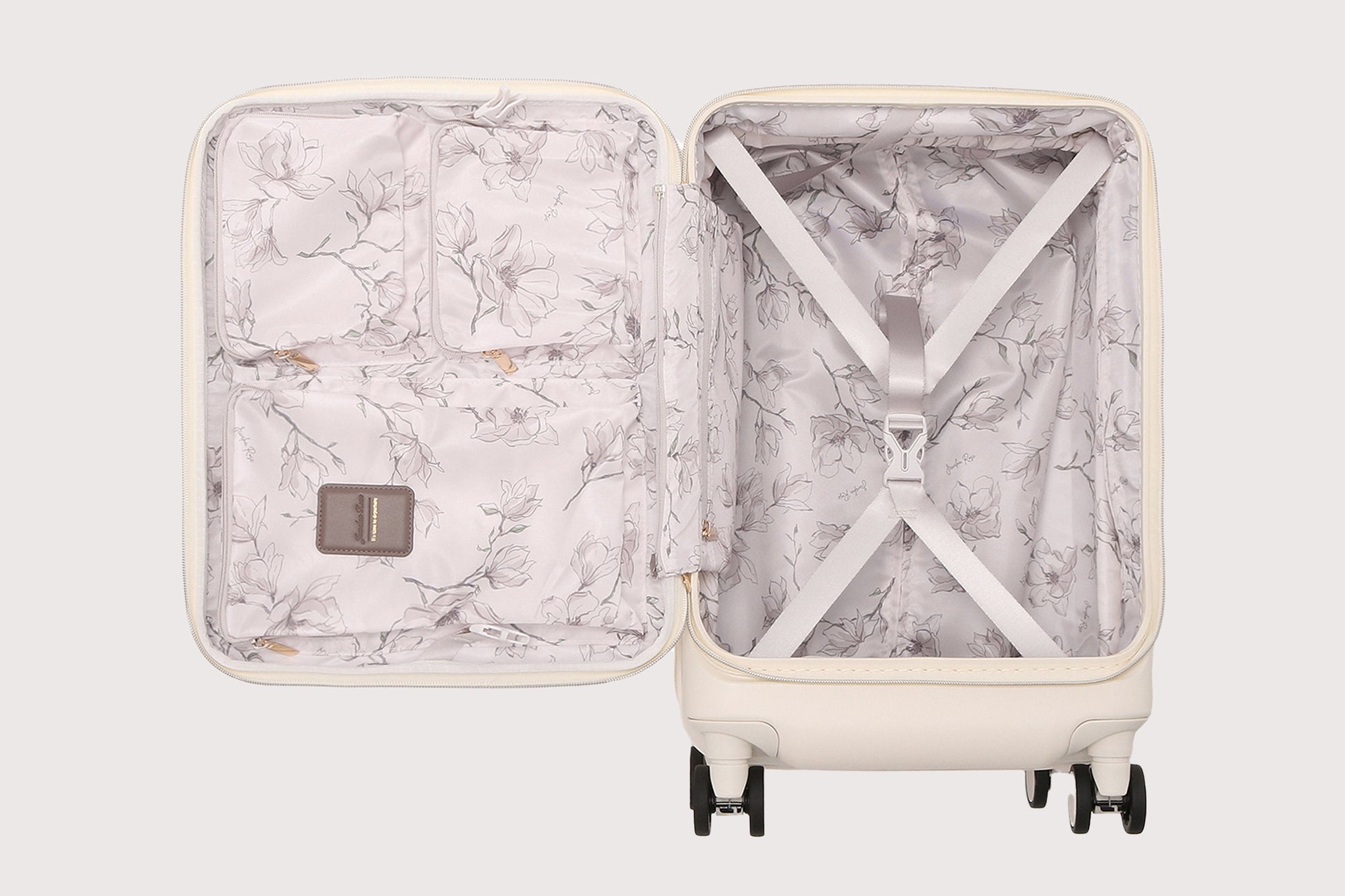 「エルダートローリー」は、大人かわいいデザインの多機能スーツケースです。省スペースで開閉できる片開き仕様で、蓋を開けると広々とした1機室のメインルームにアクセスできます。メインルーム内装には華やかな花柄プリントを施しており、同じ柄をあしらったインナーポーチが付属します。その他、移動中に便利な折りたたみ式ボトルホルダーや、旅先で荷物が増えても対応できるエキスパンダブル機能、移動中の安全性を確保するキャスターストッパー機能といった、旅を快適にする機能を多数搭載しました。機内持込サイズと預け入れサイズの2サイズを展開します。