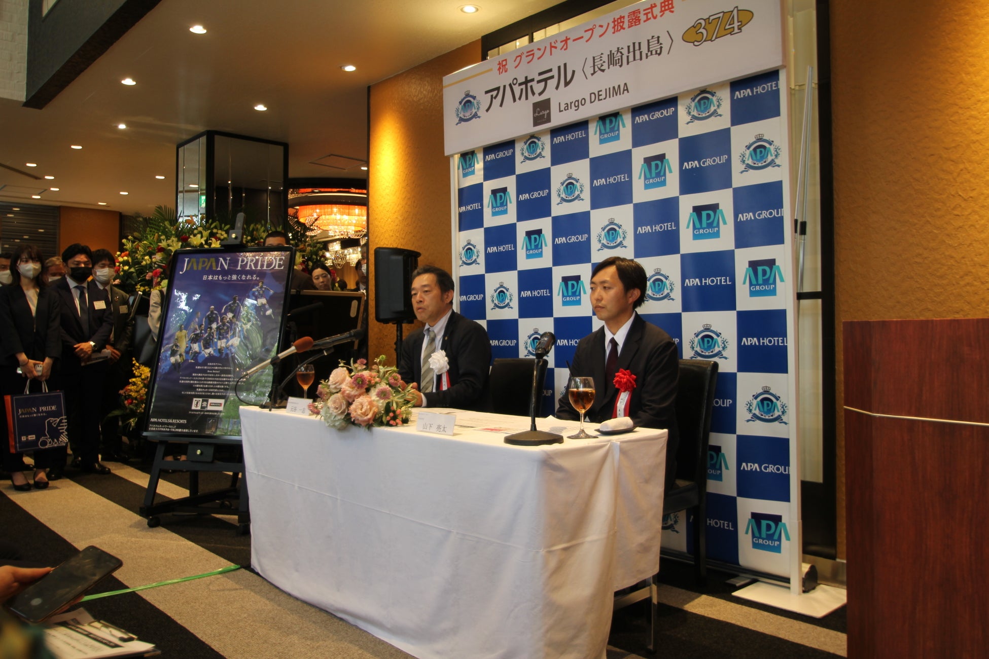 記者発表では、アパグループ社長 兼 最高経営責任者(CEO)元谷 一志は「当館は昨年12月にアパホテルとしてリブランドオープンし、以降大幅なリニューアルと36室の増室を行い、本日グランドオープンを迎えたことを大変嬉しく思う。長崎市は多くの文化遺産が点在し、ランタンフェスティバルや長崎くんちなどの伝統行事も毎年開催されることから、観光都市として世界的に注目を集めているエリアであり、今後ますます訪日外国人が増えると見込んでいる。増加する訪日対策として、アパホテルでは万国共通で認識できるピクトグラムの導入を強化しており、当ホテルでも新たに製作したピクトグラムを客室や共用部のサインに採用している。また、客室は隣り合うシングルを繋げて利用できるS-Sコネクトツインルームを多く採用し、平日はシングル、週末はツインと多様化するニーズに合わせて利用できる客室構成とした。長崎は西九州新幹線の開通後、陸路でのアクセスも至便となった。長崎はまだまだ宿泊需要が高まると予想しており、今後も良い案件があれば積極的な出店を検討していきたい。」と述べた。