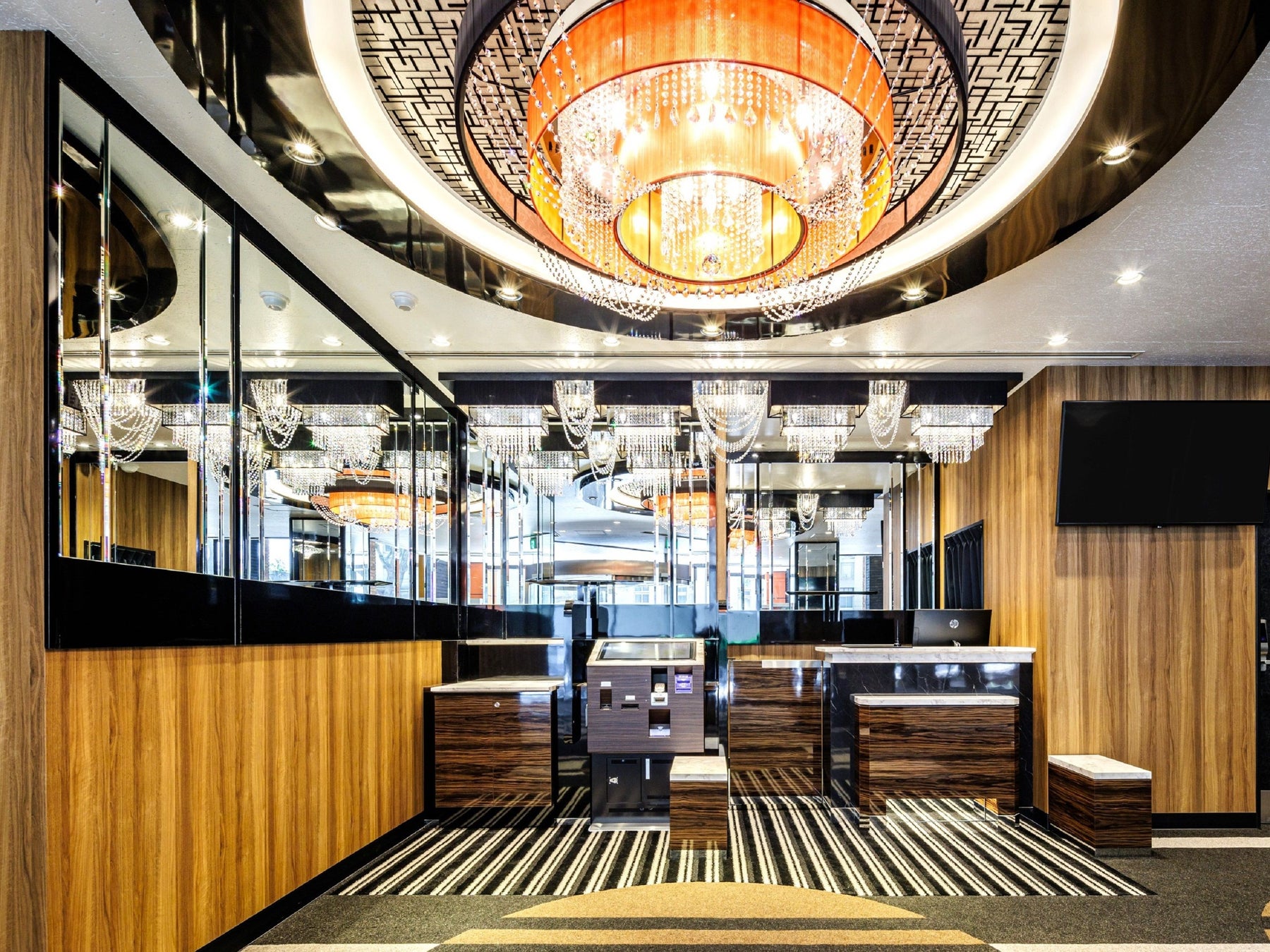 グランドオープンにあたり、エントランスにはアパホテル特有のオレンジ色のゲートを新設。フロント・ロビーには高級感のあるシャンデリアを配するなど内装を一新した。