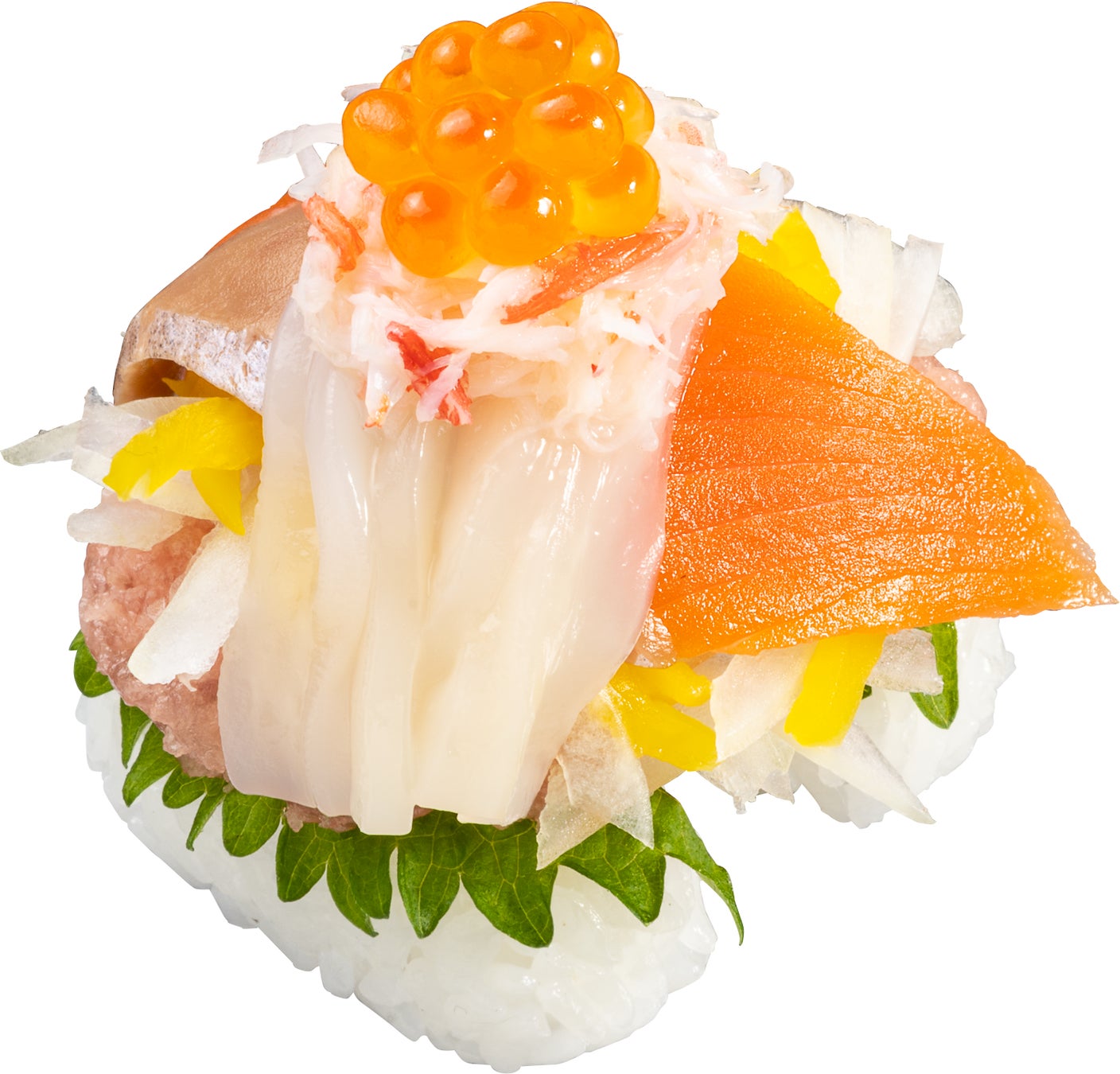 北海道産いくらや北海道産スルメイカなど5種の海鮮ネタを豪快に乗せました。