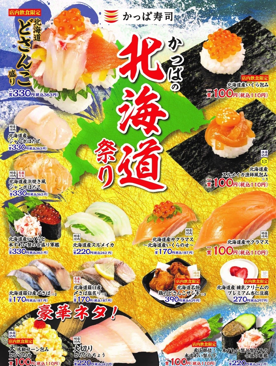 今回の『かっぱの北海道祭り』では、お得でバラエティー豊かな北海道の恵みを楽しめるよう、北海道の海の幸を味わう寿司や北海道の郷土料理をアレンジした商品をご用意しました。『北海道産いくら包み』『北海道産スルメイカ漁師風包み』『北海道産サクラマス』などを、各一貫100 円(税込110 円)でお楽しみいただけます。また、北海道羅臼港で水揚げされた鯖を使った「北海道羅臼産〆さば」や「北海道産スルメイカ」、海の幸をふんだんに盛り込んだ「北海道どさんこ盛り」などもご用意しました。食の宝庫と呼ばれる北海道の魅力溢れる食をご堪能ください。