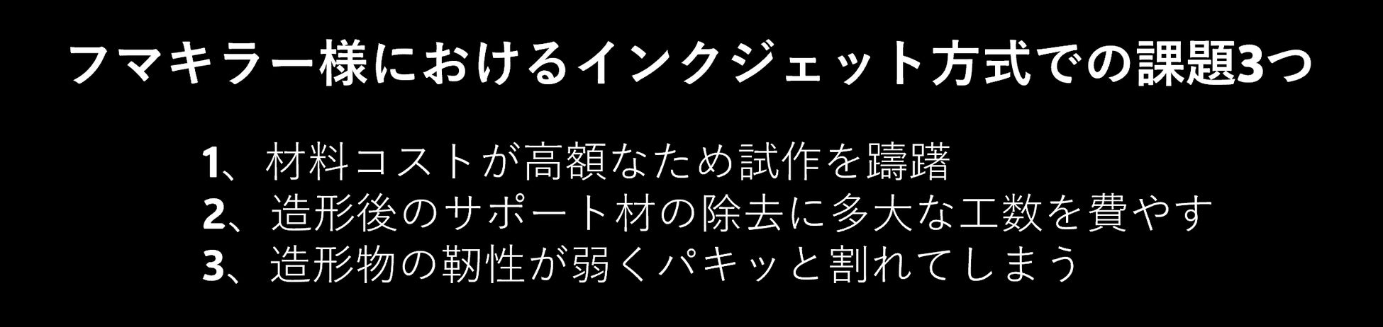 世界70か国へ殺虫剤などの製品を展開しているグローバル企業・フマキラー。成形品の開発を従来工法から3Dプリンターへ見直しをしたが、以前保有していたインクジェット方式3Dプリンタ―では主に3つの課題を抱えていました。