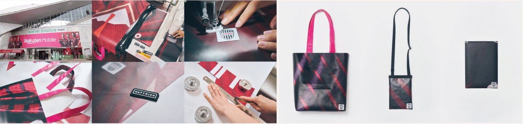 そしてこの度、「HATTRICK Members」において、ヴィッセル神戸とのアップサイクルアイテムの数量限定追加販売が決定いたしました。6月30日(日)に行われた鹿島アントラーズ戦のブース出展でも人気を集めたアイテムで、J1王者に輝いた2023シーズンを彩ったスタジアム看板(ファサード)をトートバッグ・サコッシュに、またレジェンドウォークに掲出されていたビッグポスターをエンベロープにアップサイクルしました。