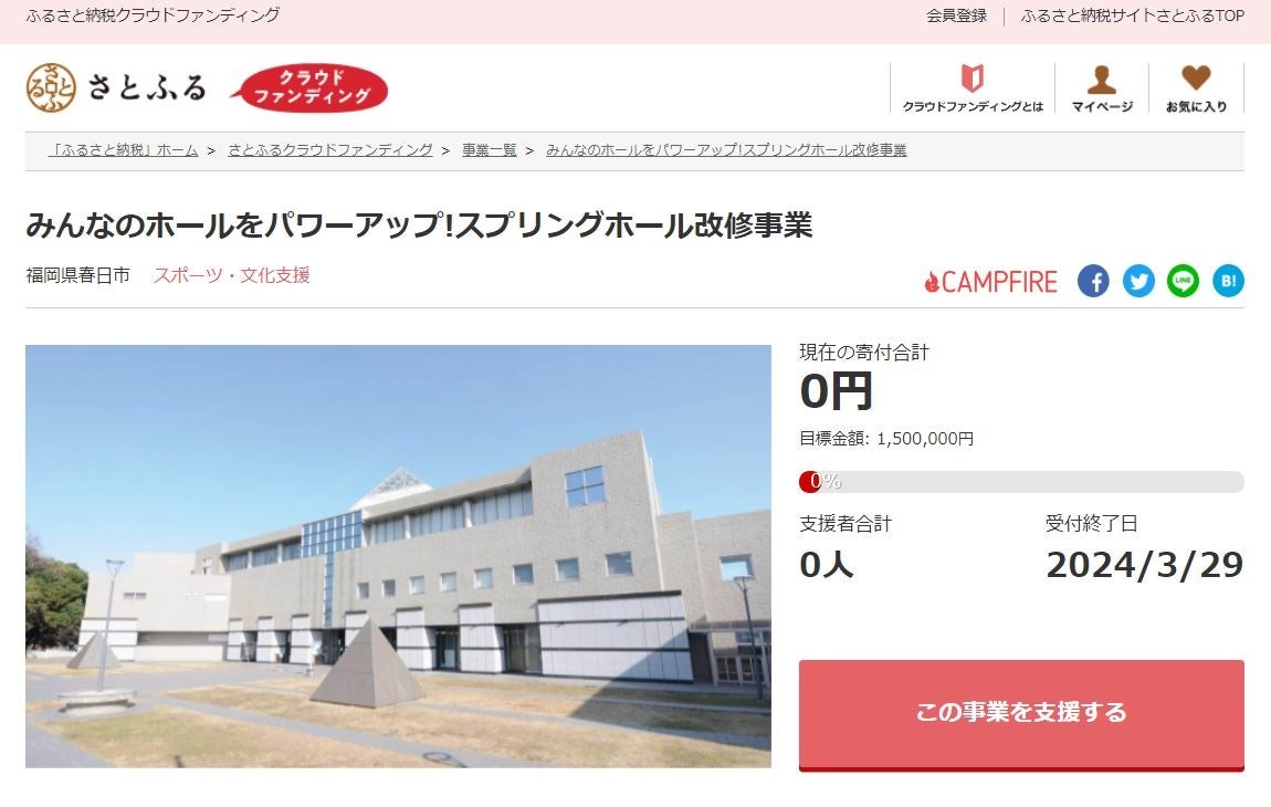 福岡県春日市とさとふる、春日市ふれあい文化センター「スプリングホール」の老朽化した設備を改修するため、寄付受け付けを開始