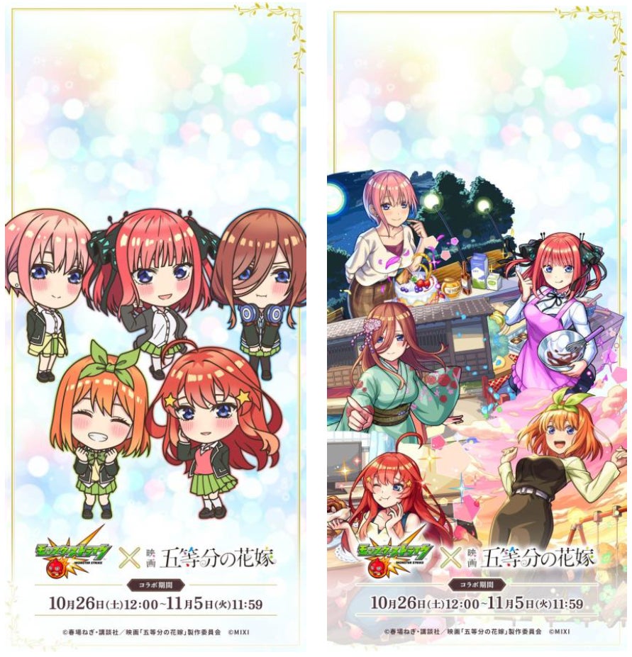 株式会社MIXI(東京都渋谷区、代表取締役社長 上級執行役員 CEO:木村 弘毅)は、スマホアプリのひっぱりハンティングRPG「モンスターストライク」(以下モンスト)において、「五等分の花嫁」との初コラボを10月26日(土)12:00より開催します。