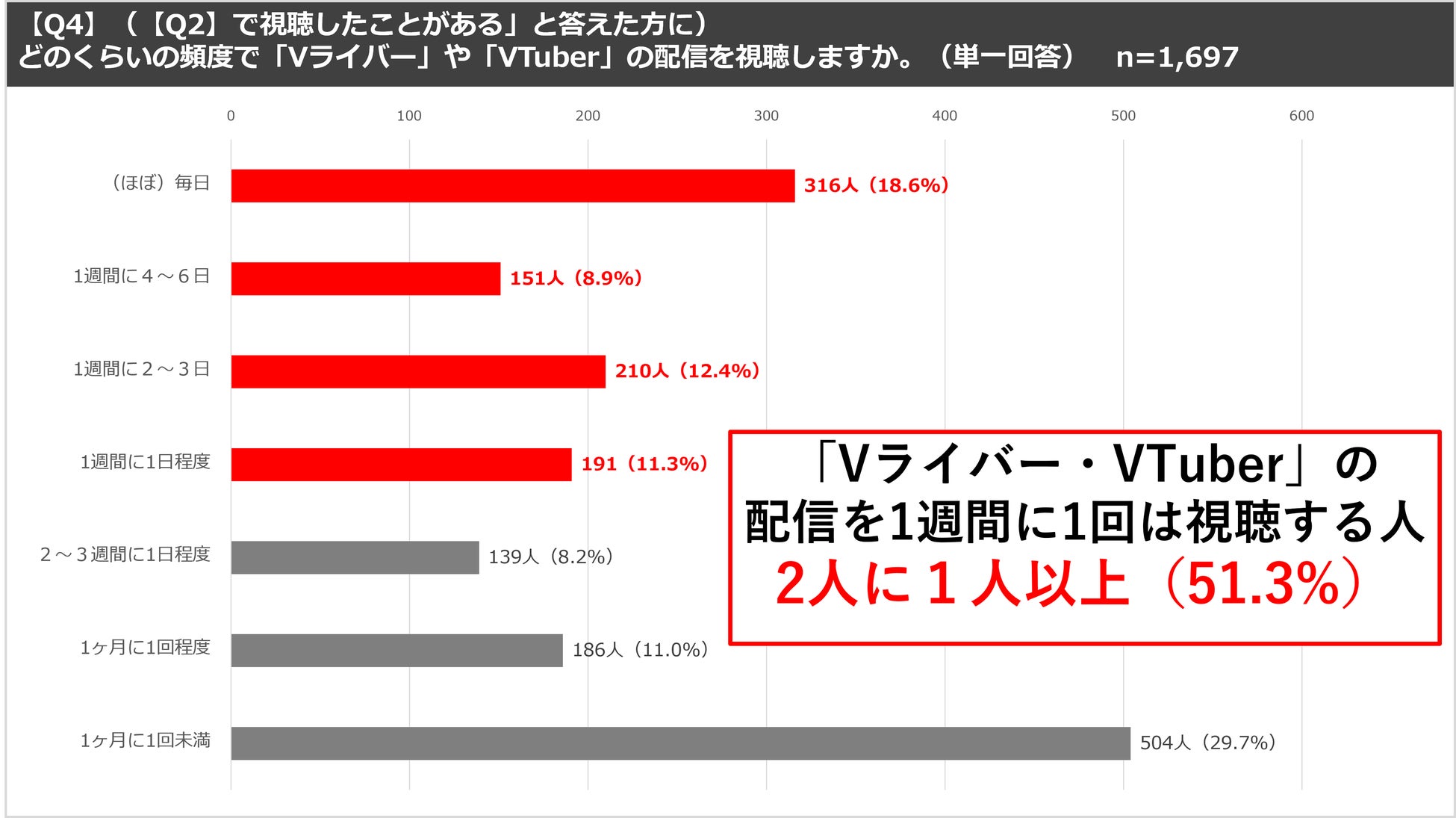 『どのくらいの頻度で「Vライバー」や「VTuber」の配信を視聴しますか。』という質問に対して、「VライバーやVTuberの配信を視聴したことがある」と回答した人のうち、2人に1人以上(51.3%)が 1週間に1回以上VライバーやVTuberの配信を視聴していると回答し、豊富なジャンルが存在するライブ配信市場において「Vライバー」や「VTuber」は比較的視聴されることが多い配信ジャンルであることが明らかになりました。