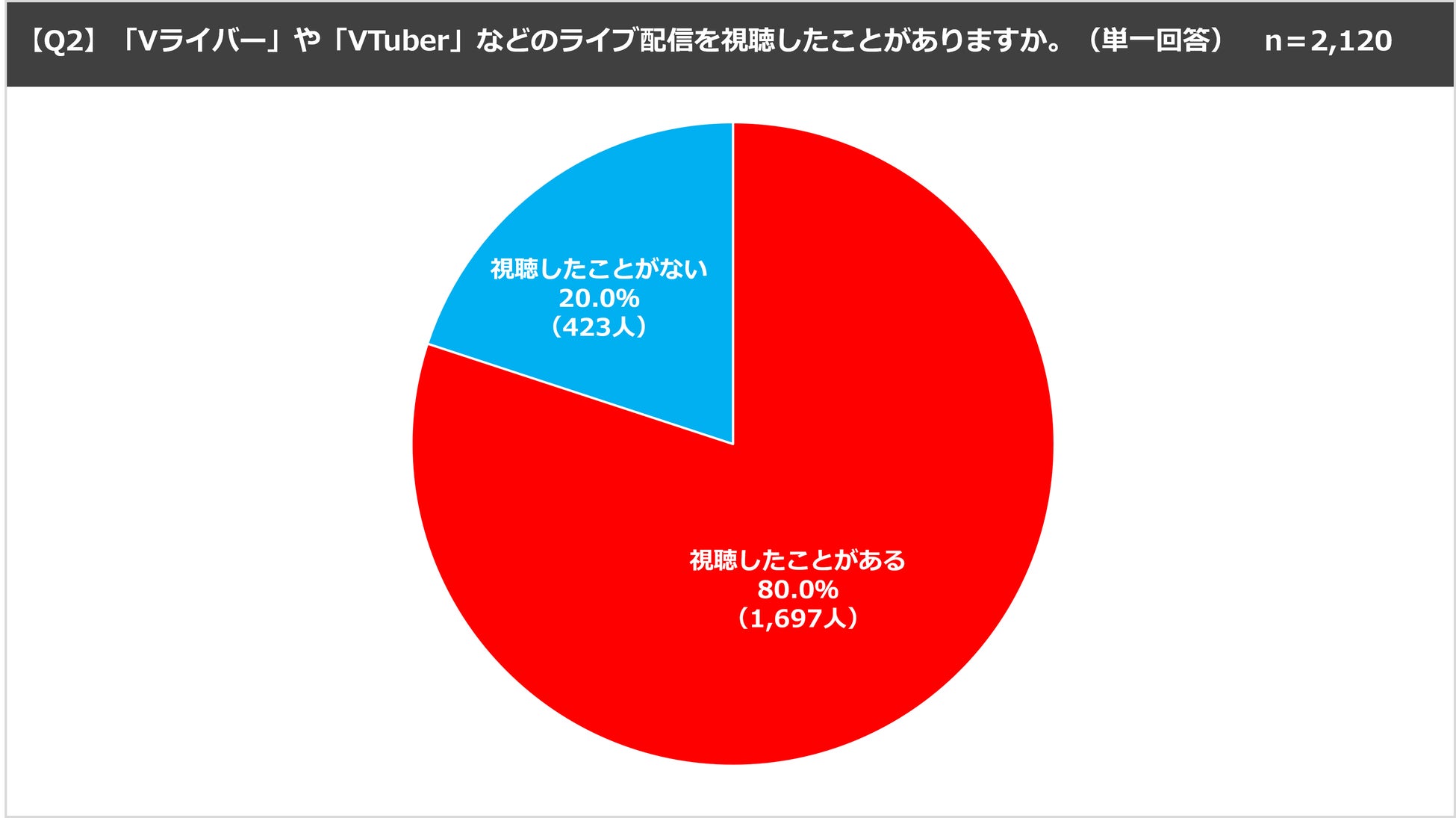 また、『「Vライバー」や「VTuber」などのライブ配信を視聴したことがありますか。』という質問に対して、80.0%が「視聴したことがある」と回答し、「17LIVE」を利用するユーザーにとって「Vライバー・VTuber」が身近な存在になっていることが分かりました。