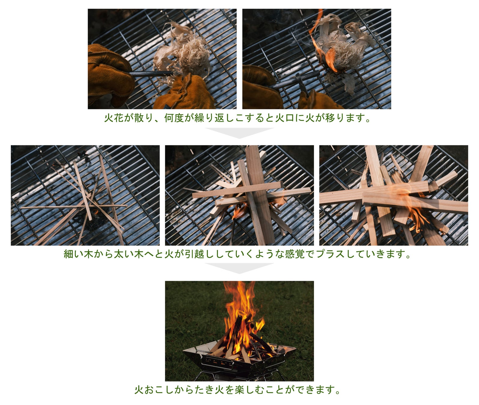 アウトドア初心者やお子様でも火おこしからたき火が楽しめる「ファイヤーストライカーセット」を、ご家族でのキャンプなどの際に、ぜひご活用ください。