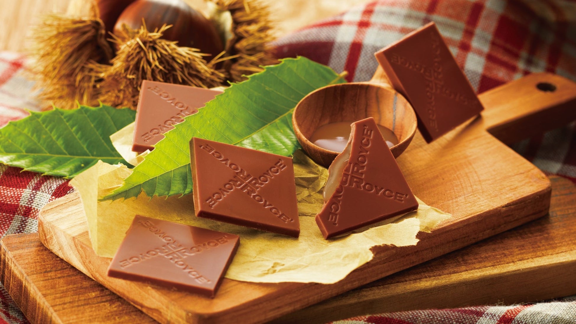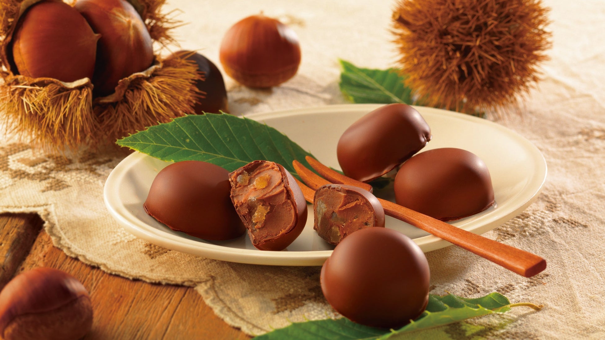 栗が香る薄さ3㎜の繊細なチョコレートの中に、栗風味のコクがあるソースを閉じ込めました。ひと口食べると中からとろりとソースがあふれ出す、栗のおいしさに心まで満たされるショコラです。